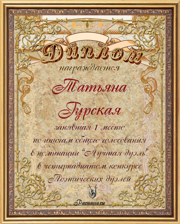 Диплом за 1-е место в номинации "ЛУЧШАЯ ДУЭЛЬ" по итогам общего голосования в 15ом конкурсе поэтических дуэлей (№ 10.1)