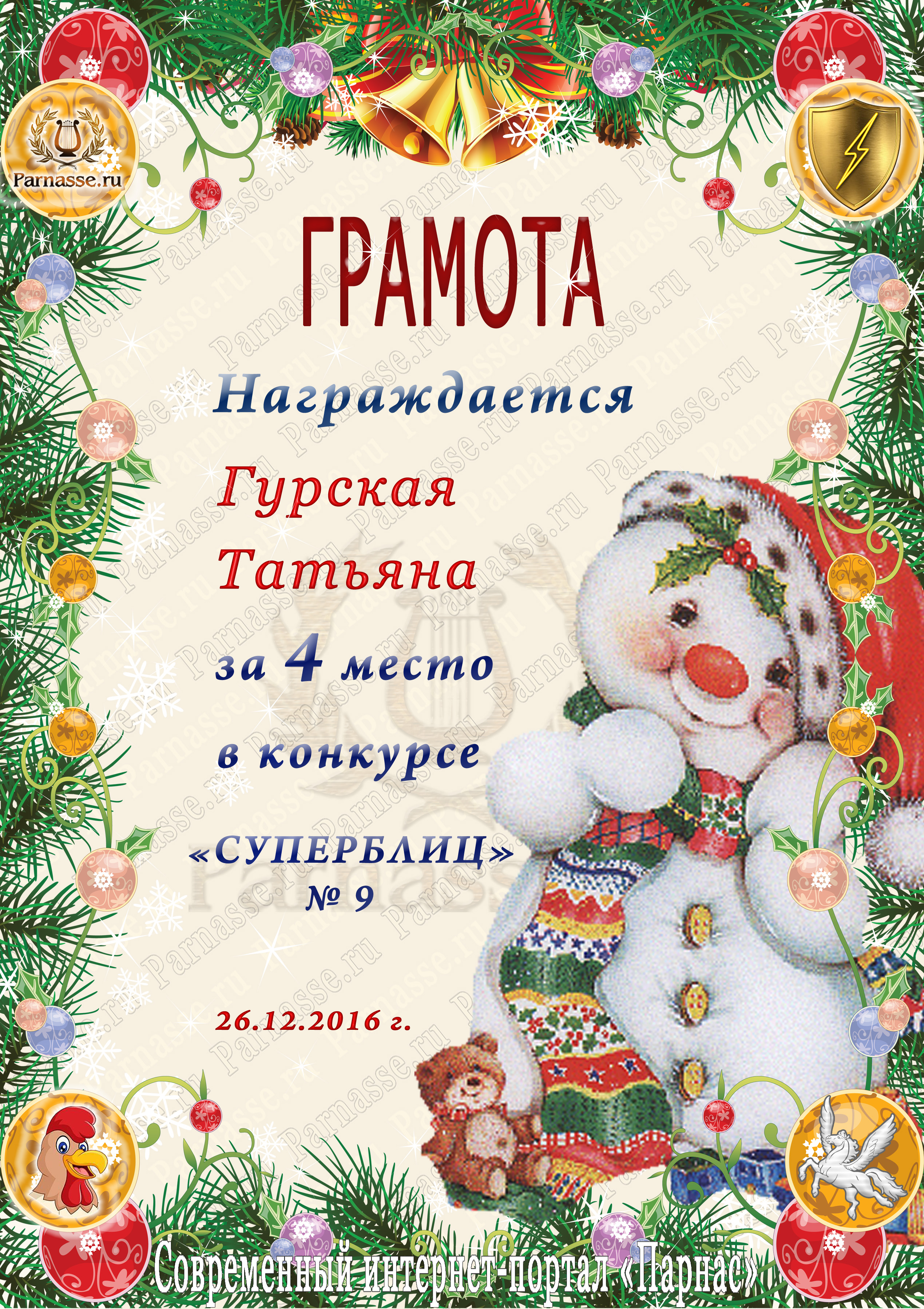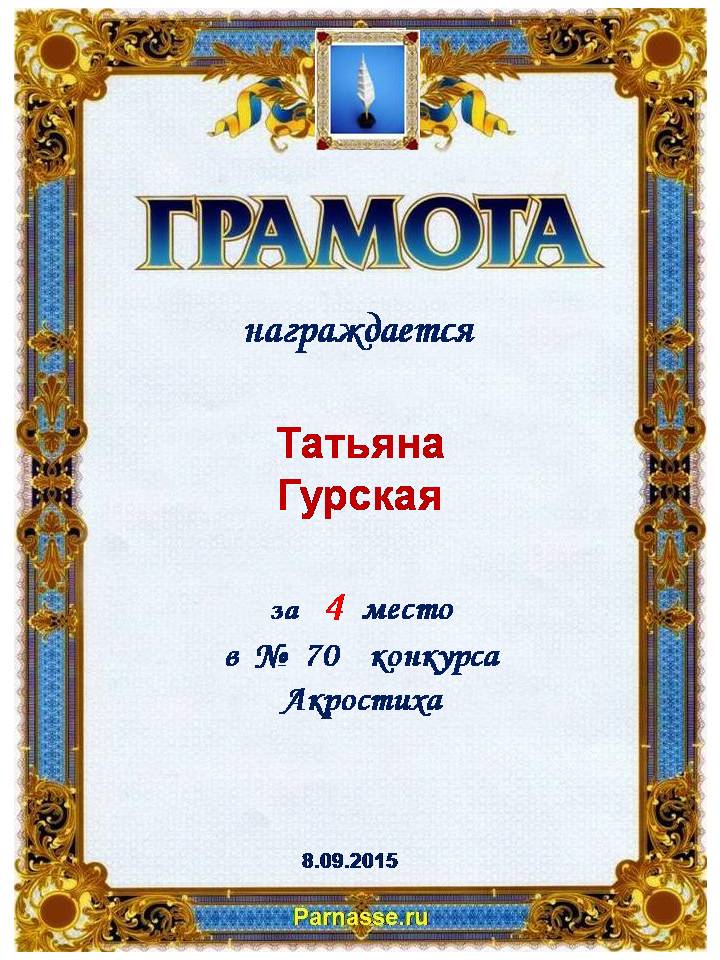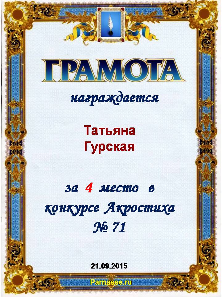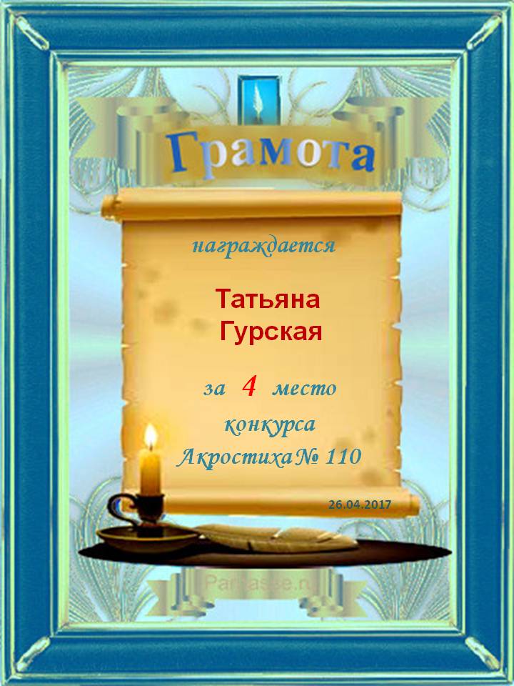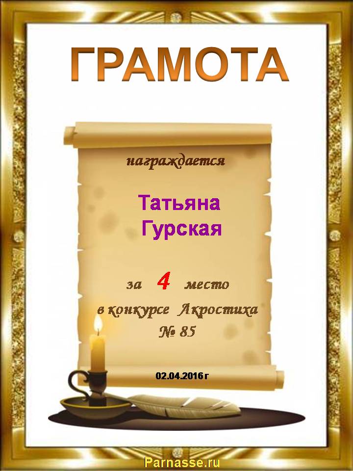Грамота за 4 место в 122 конкурсе АКРОСТИХА (Альтернатива)! ПОЗДРАВЛЯЮ!