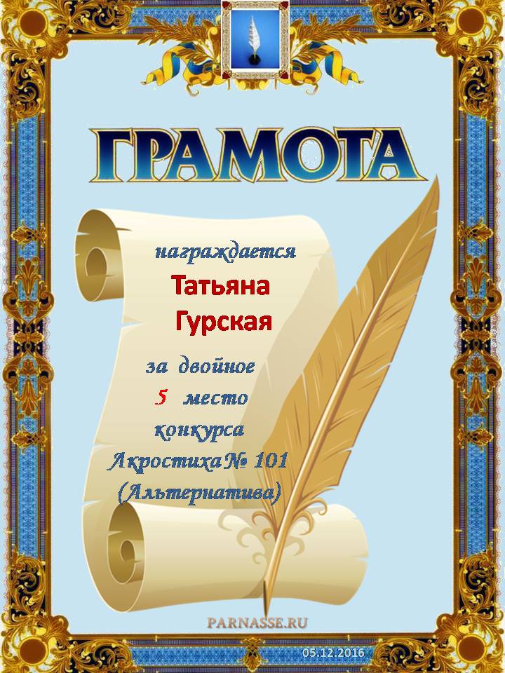 Грамота за двойное 5 место в 101 конкурсе АКРОСТИХА (Альтернатива)! ПОЗДРАВЛЯЮ!