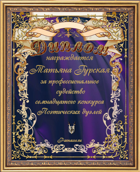 ДИПЛОМ ЗА ПРОФЕССИОНАЛЬНОЕ СУДЕЙСТВО СЕМНАДЦАТОГО КОНКУРСА ПОЭТИЧЕСКИХ ДУЭЛЕЙ