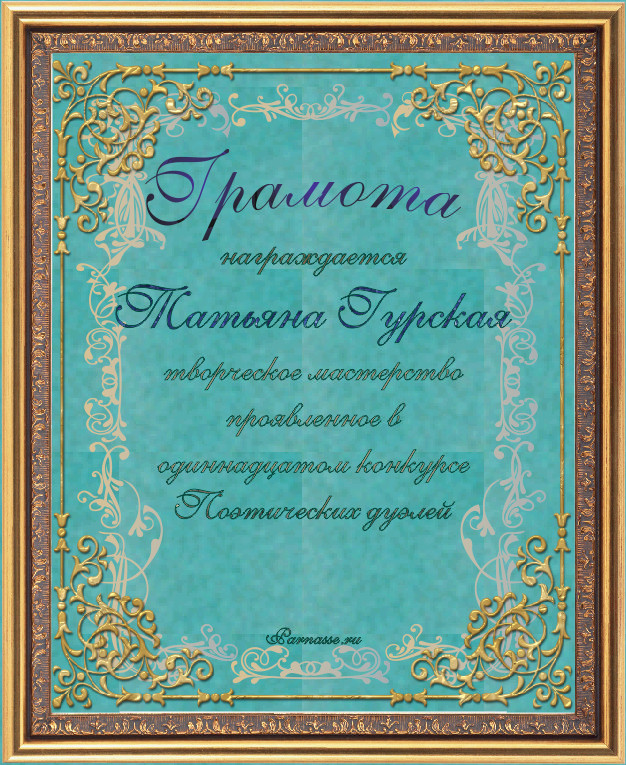 За 3-е место в номинации "ЛУЧШАЯ ДУЭЛЬ" 11го конкурса ПОЭТИЧЕСКИХ ДУЭЛЕЙ, по итогам общего голосования, в паре с Лорой Вербицкой