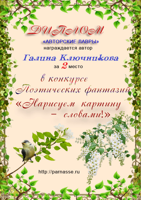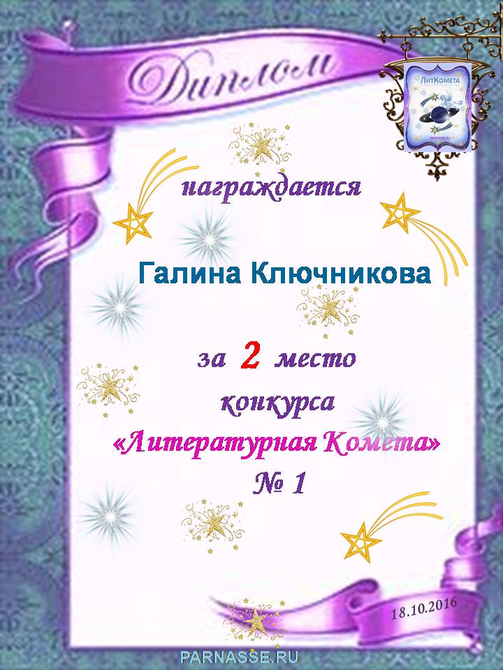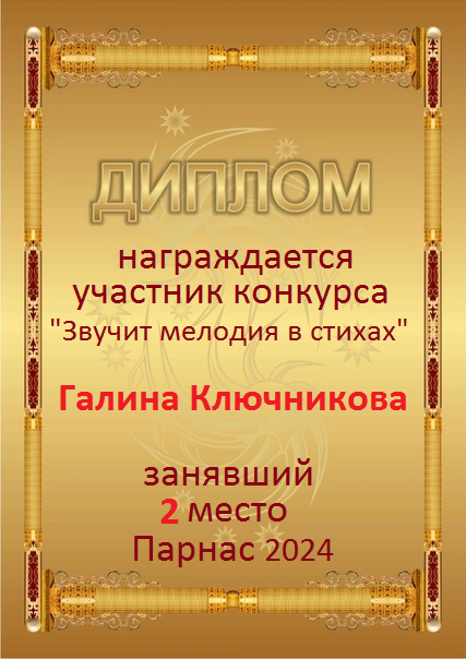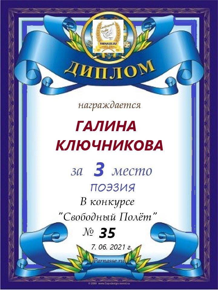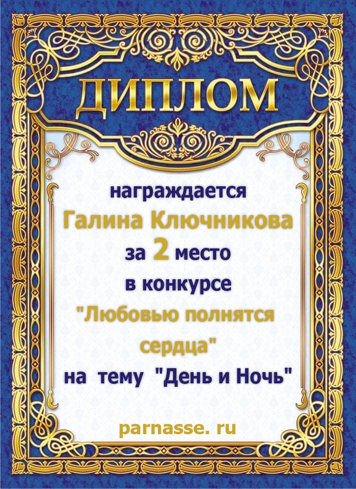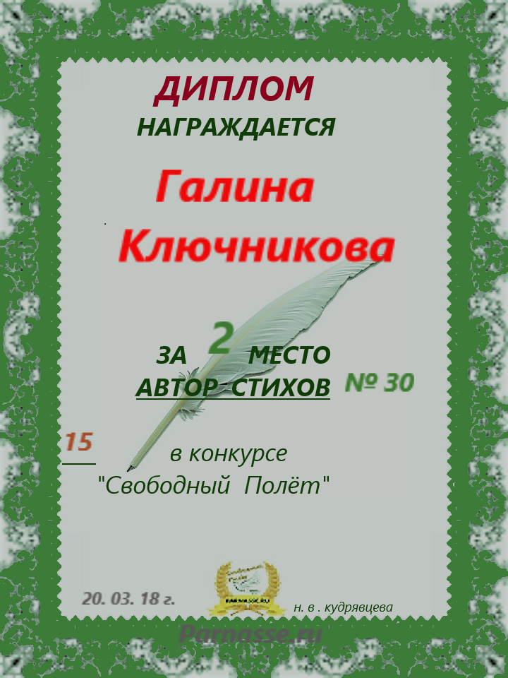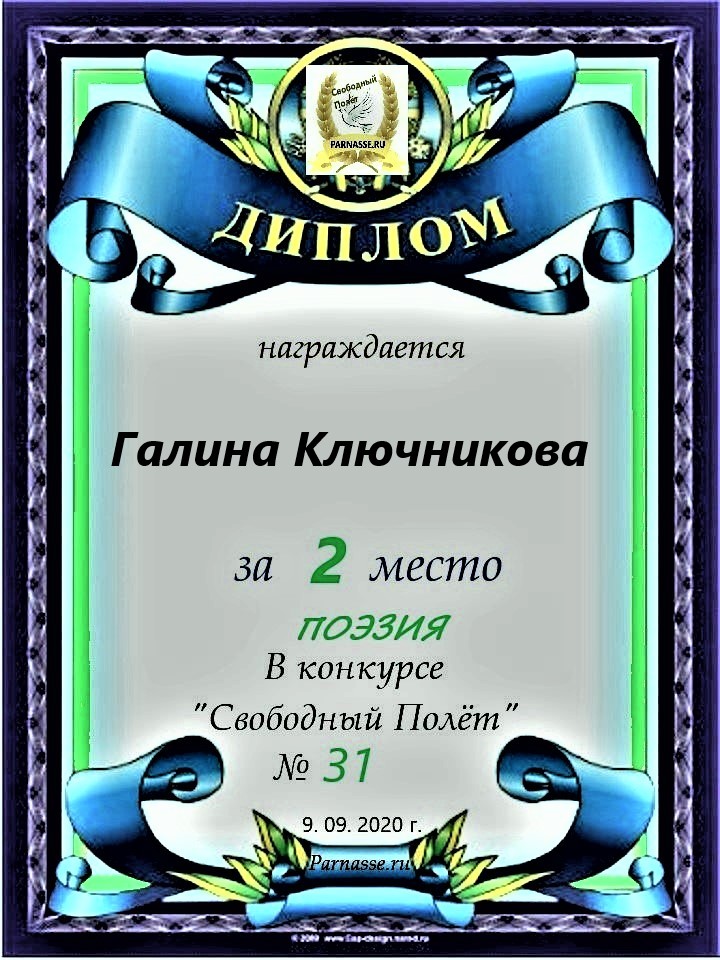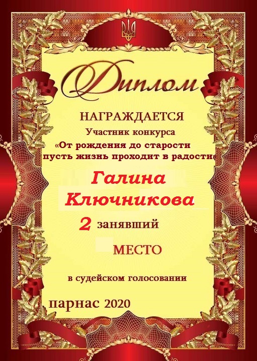 Диплом за 2 место в конкурсе авторского стиха №2 под названием "У каждого есть в жизни Берег Детства".ПОЗДРАВЛЯЕМ!