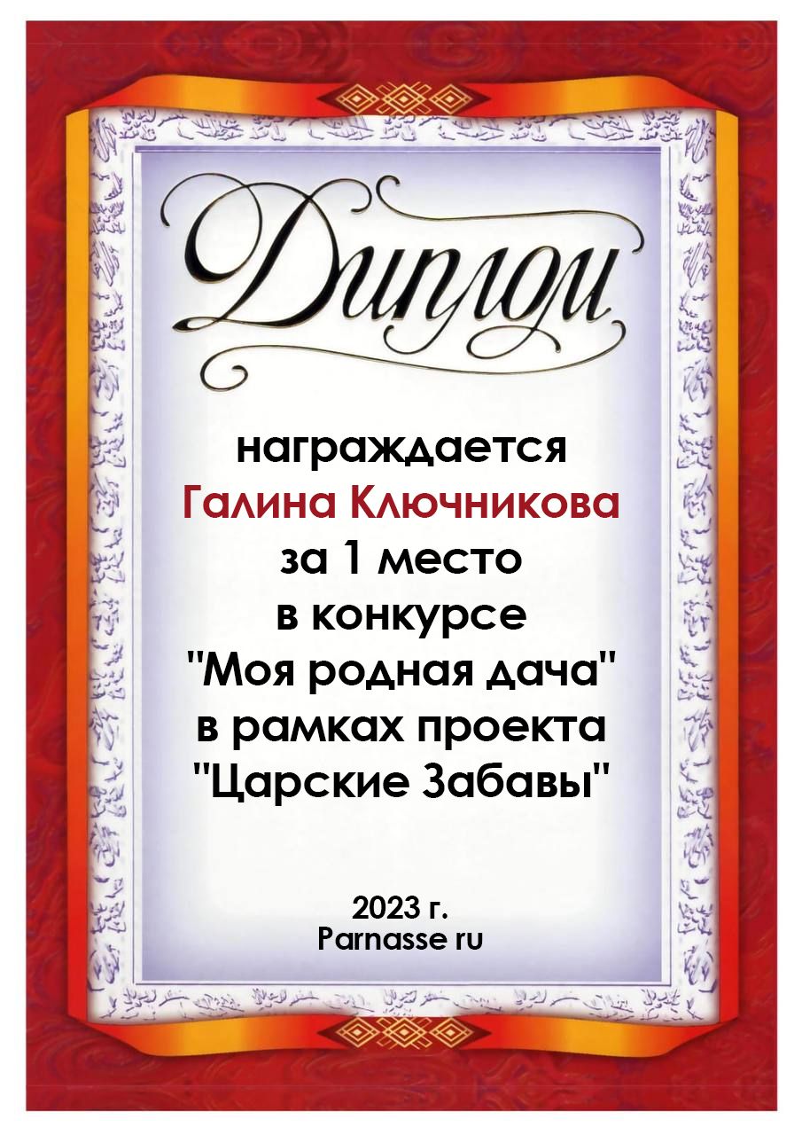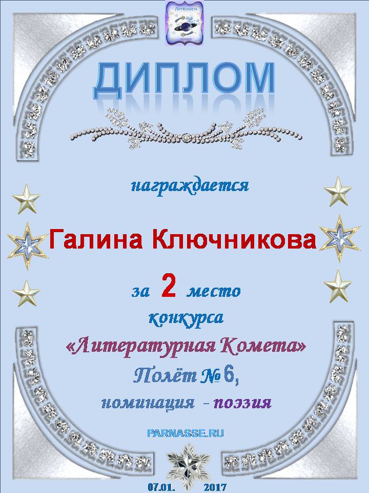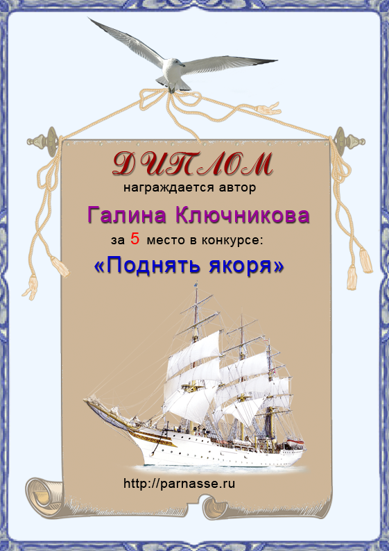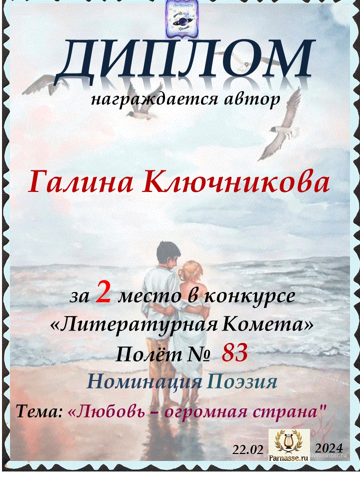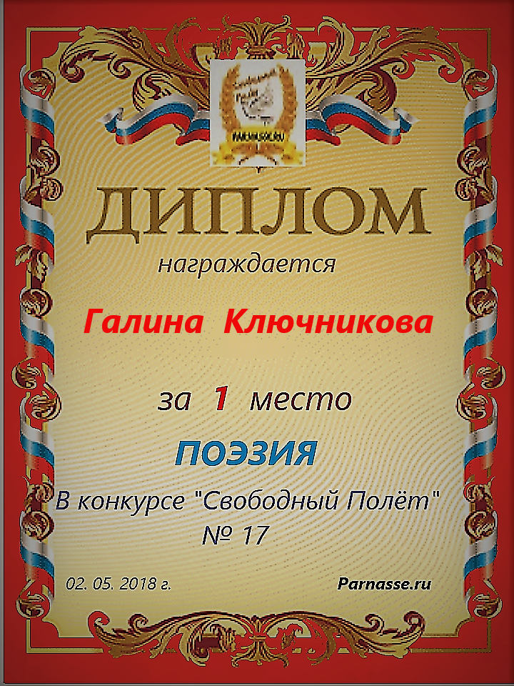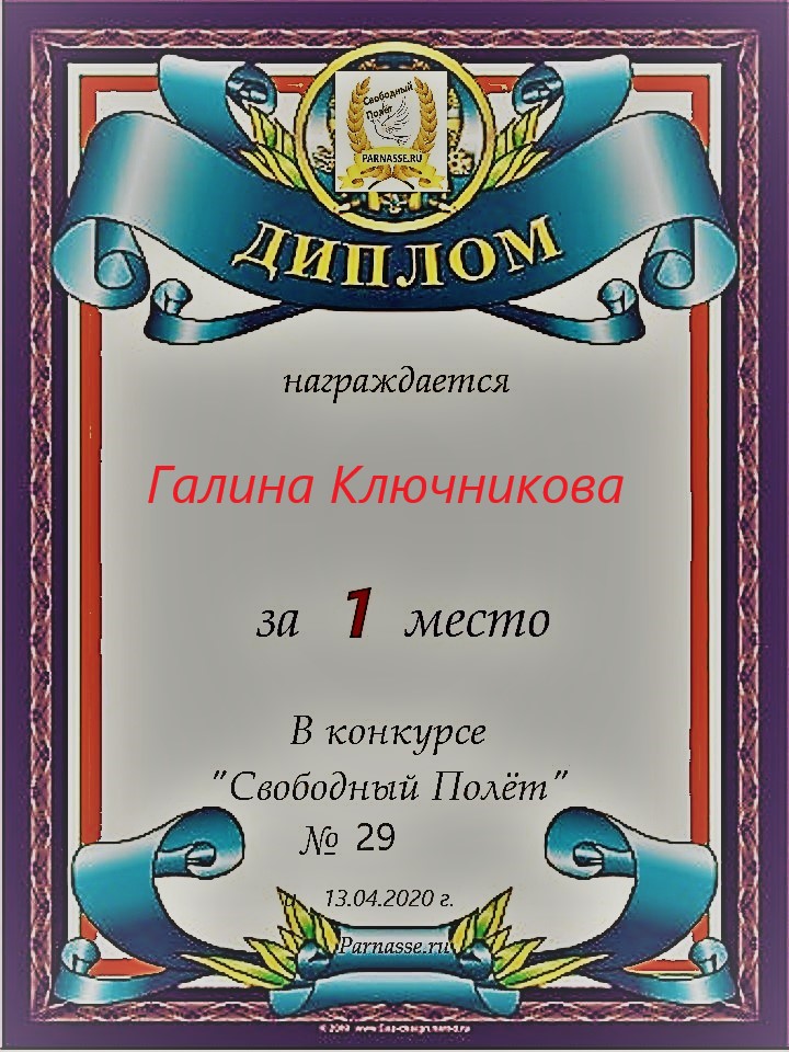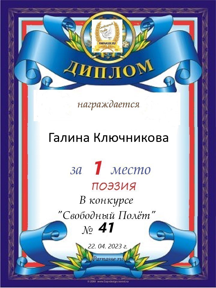 Диплом за 2 место в конкурсе авторского стиха №2 под названием "У каждого есть в жизни Берег Детства".ПОЗДРАВЛЯЕМ!