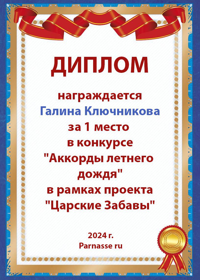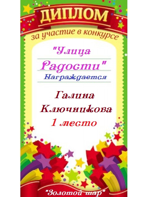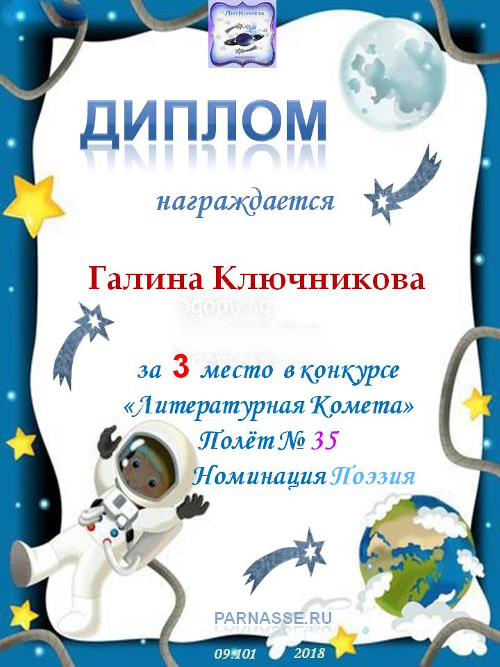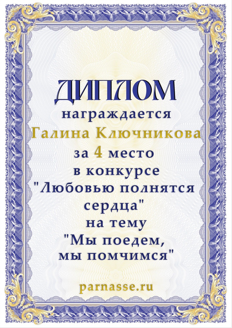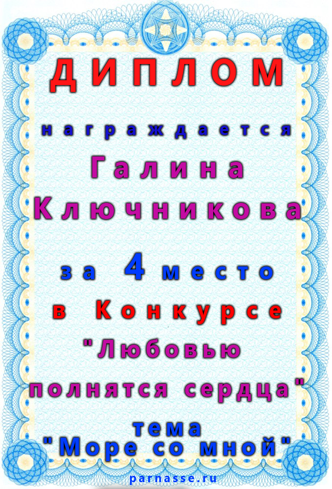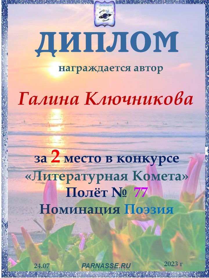 Диплом за 2 место в конкурсе авторского стиха №2 под названием "У каждого есть в жизни Берег Детства".ПОЗДРАВЛЯЕМ!