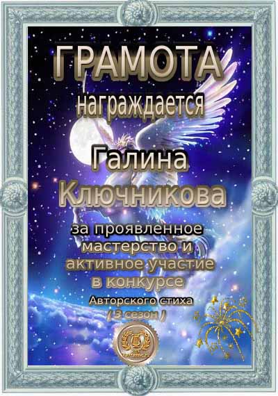 За проявленное мастерство и активное участиев конкурсе Авторского стиха (3 сезон)