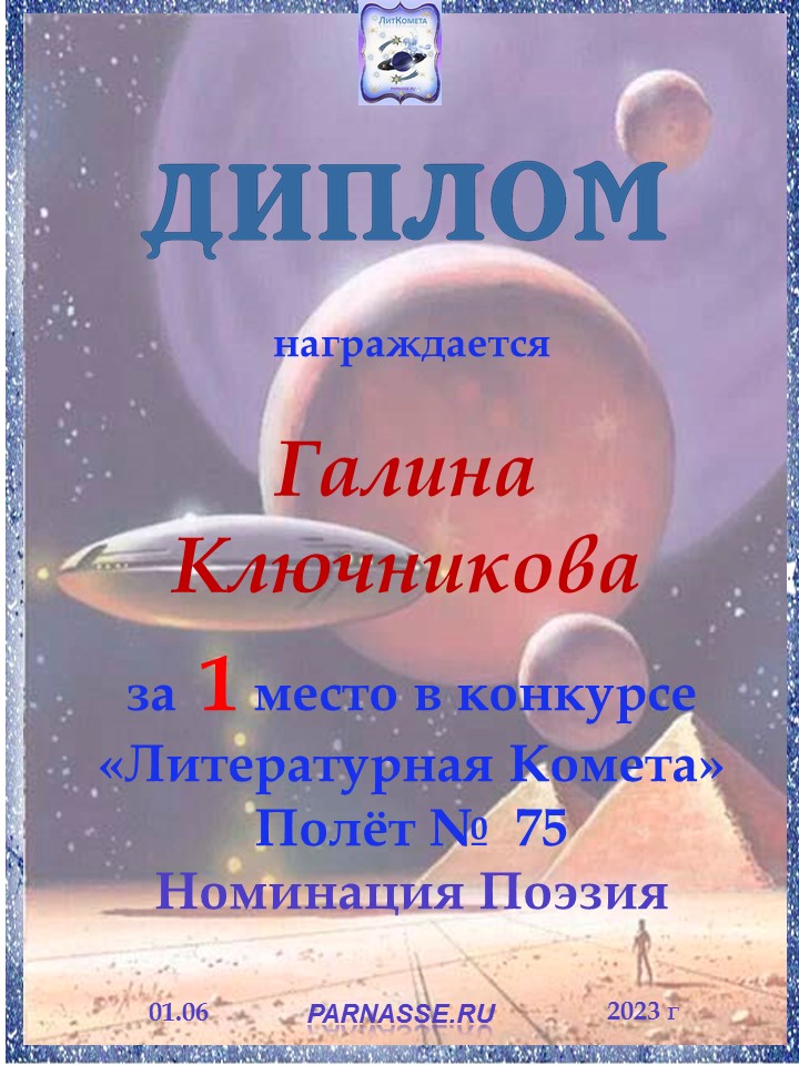 ![]() Медаль за 1 место в конкурсе "ЛитКомета - Полёт № 95" - номинация Поэзия