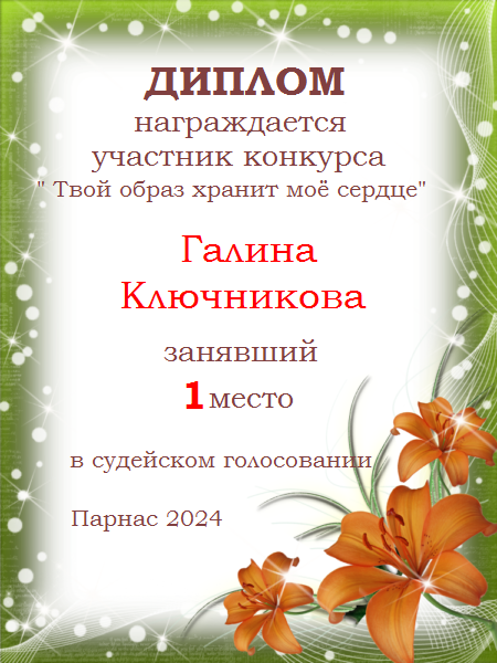 ГАЛИНА, ПОЗДРАВЛЯЮ С ЗАСЛУЖЕННОЙ ПОБЕДОЙ! 2 МЕСТО! ТАК ДЕРЖАТЬ!
