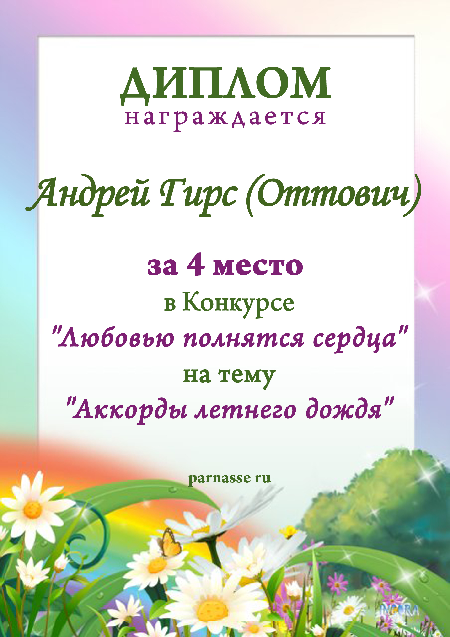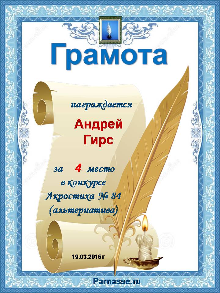 Грамота за 4 место в 139 конкурсе АКРОСТИХА (Альтернатива)! ПОЗДРАВЛЯЮ!