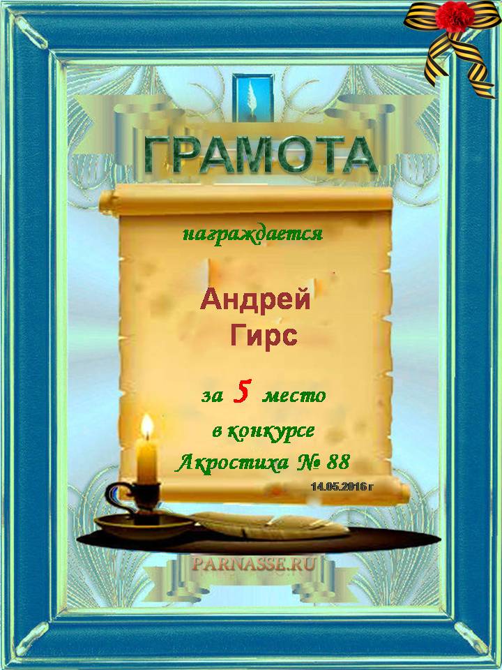 Грамота за 5 место в 115 конкурсе АКРОСТИХА (Альтернатива)! ПОЗДРАВЛЯЮ!