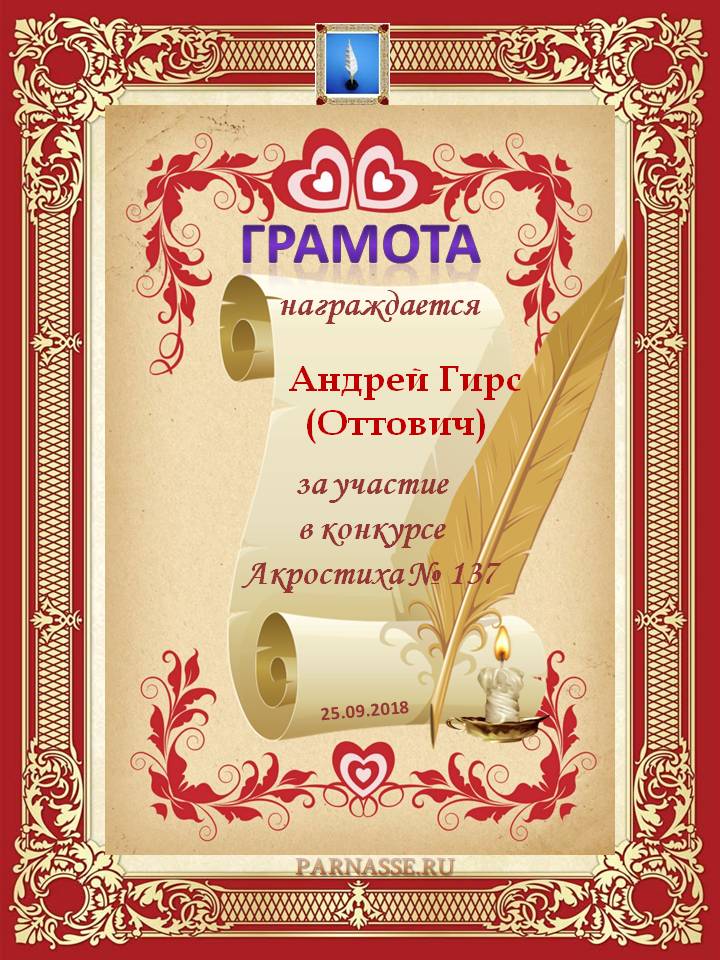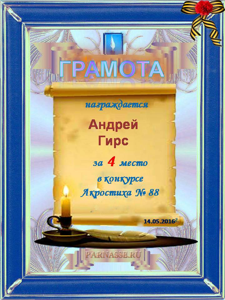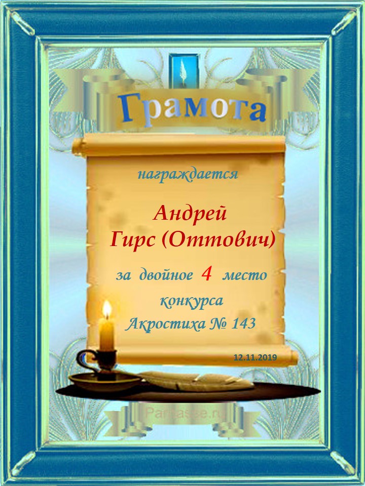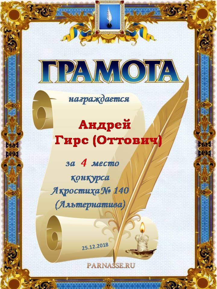 Грамота за 4 место в 141 конкурсе АКРОСТИХА (Альтернатива)! ПОЗДРАВЛЯЮ!