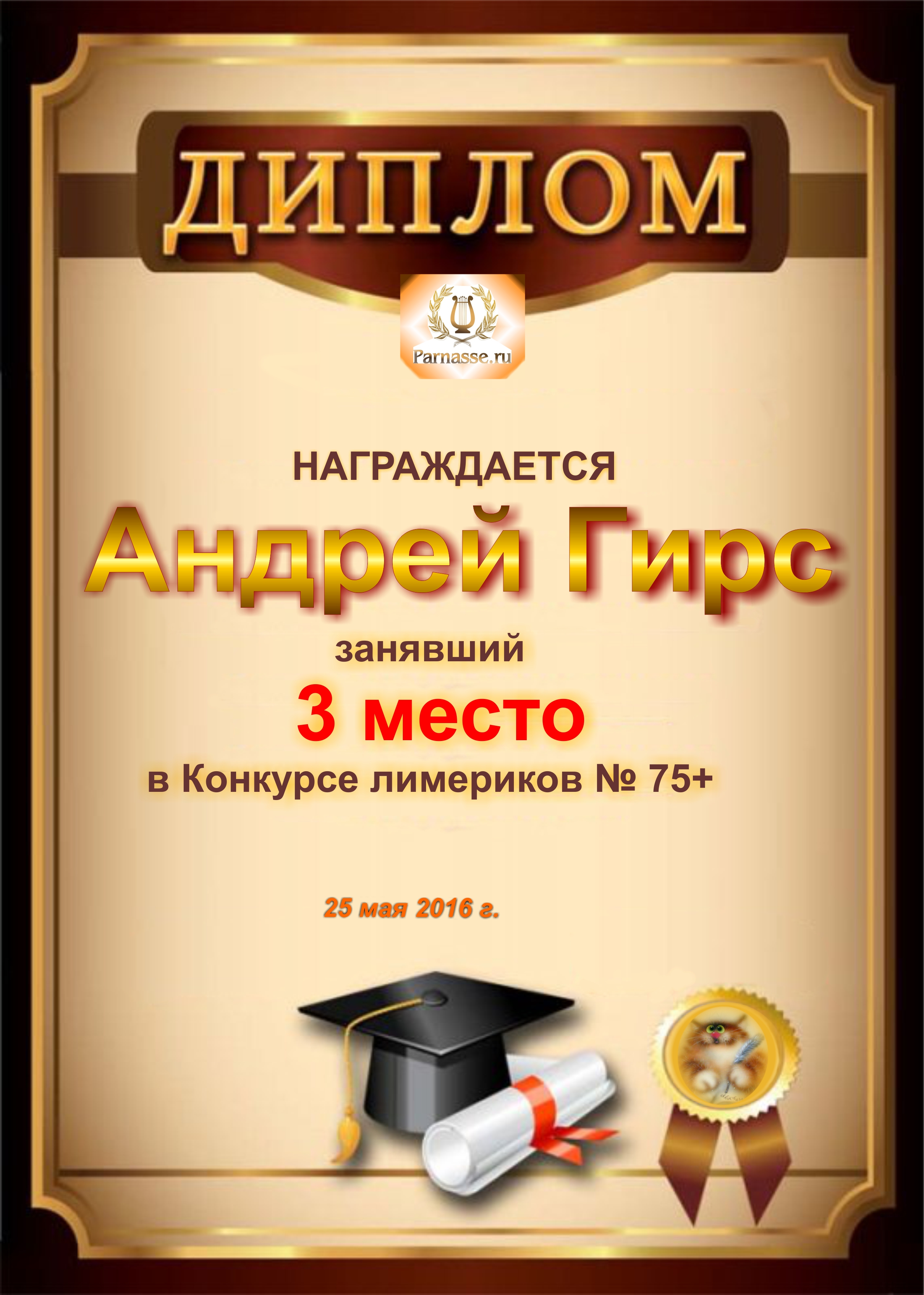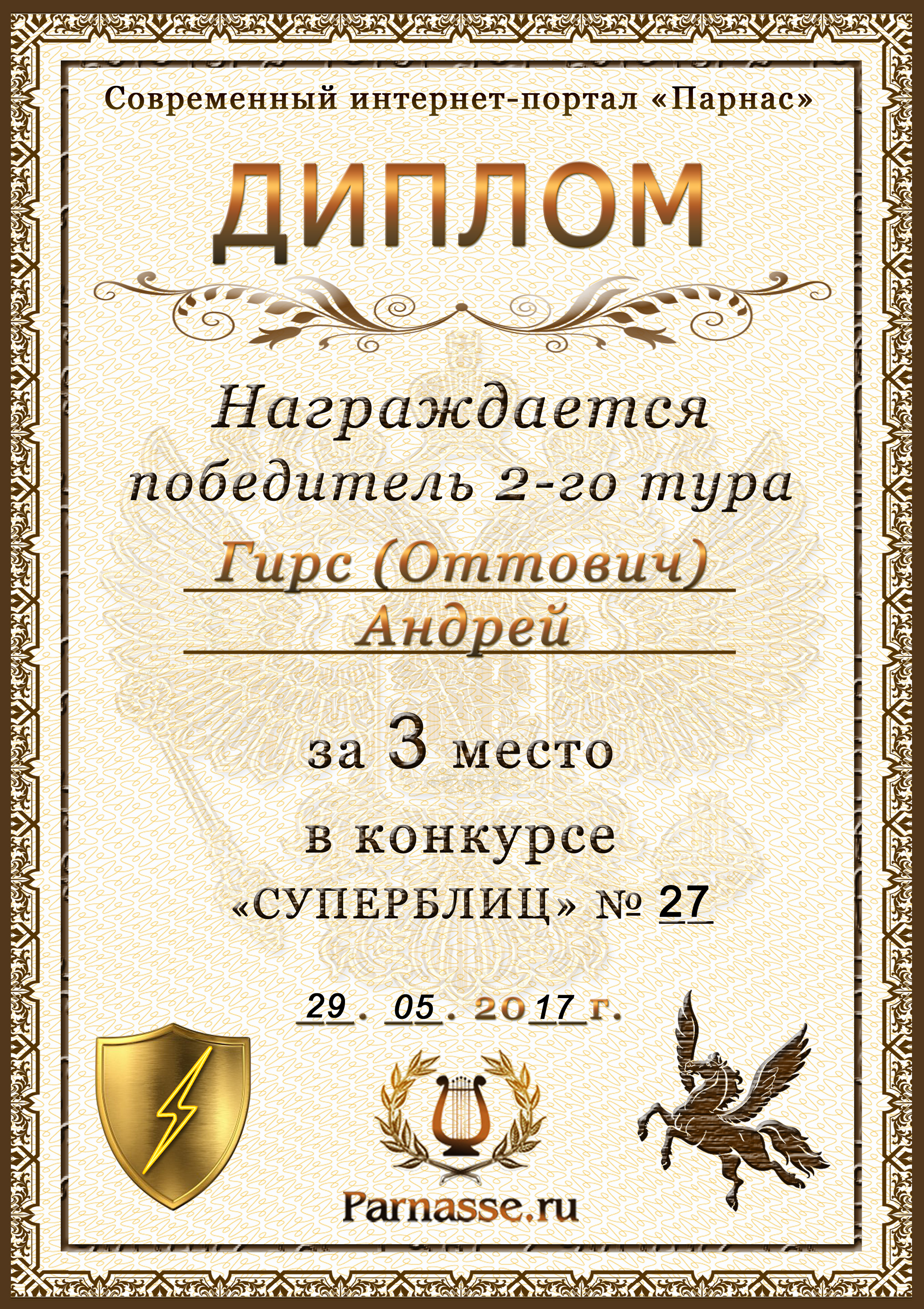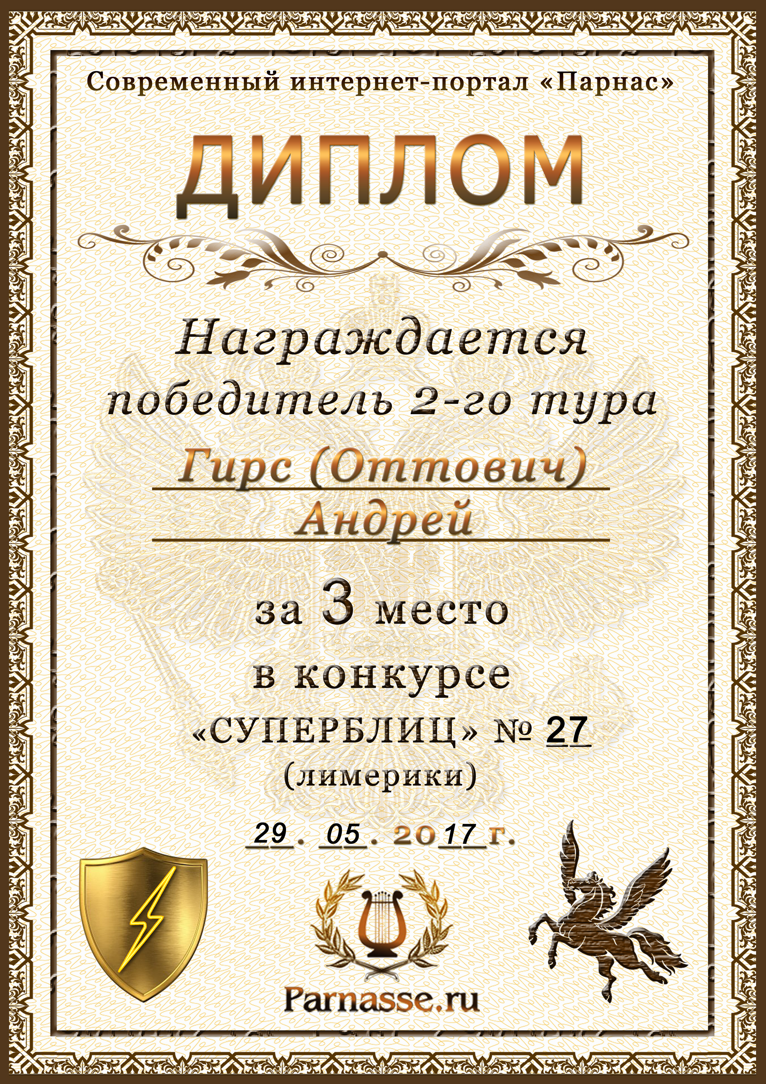 Диплом за 3 место во 2 туре (лимерики) в конкурсе СУПЕРБЛИЦА № 27!ПОЗДРАВЛЯЮ!