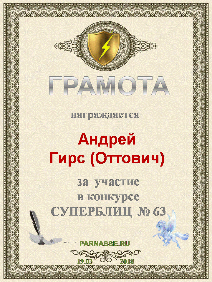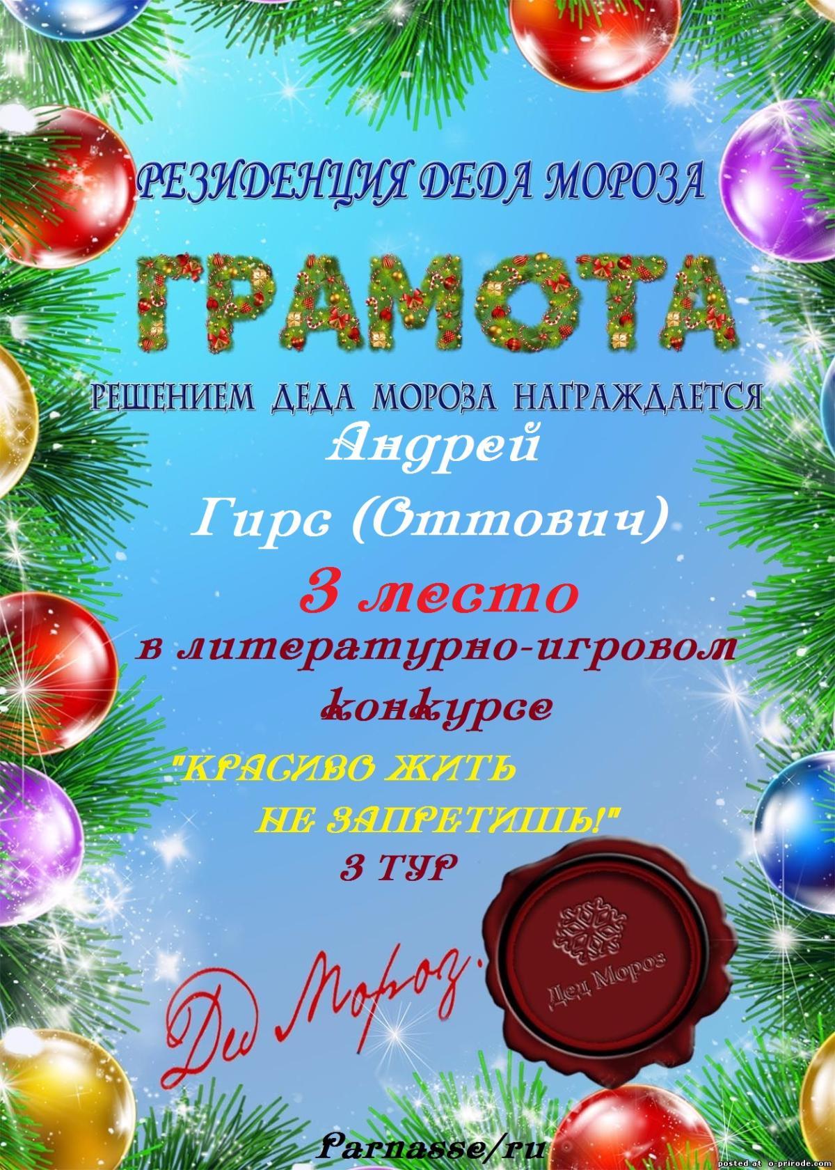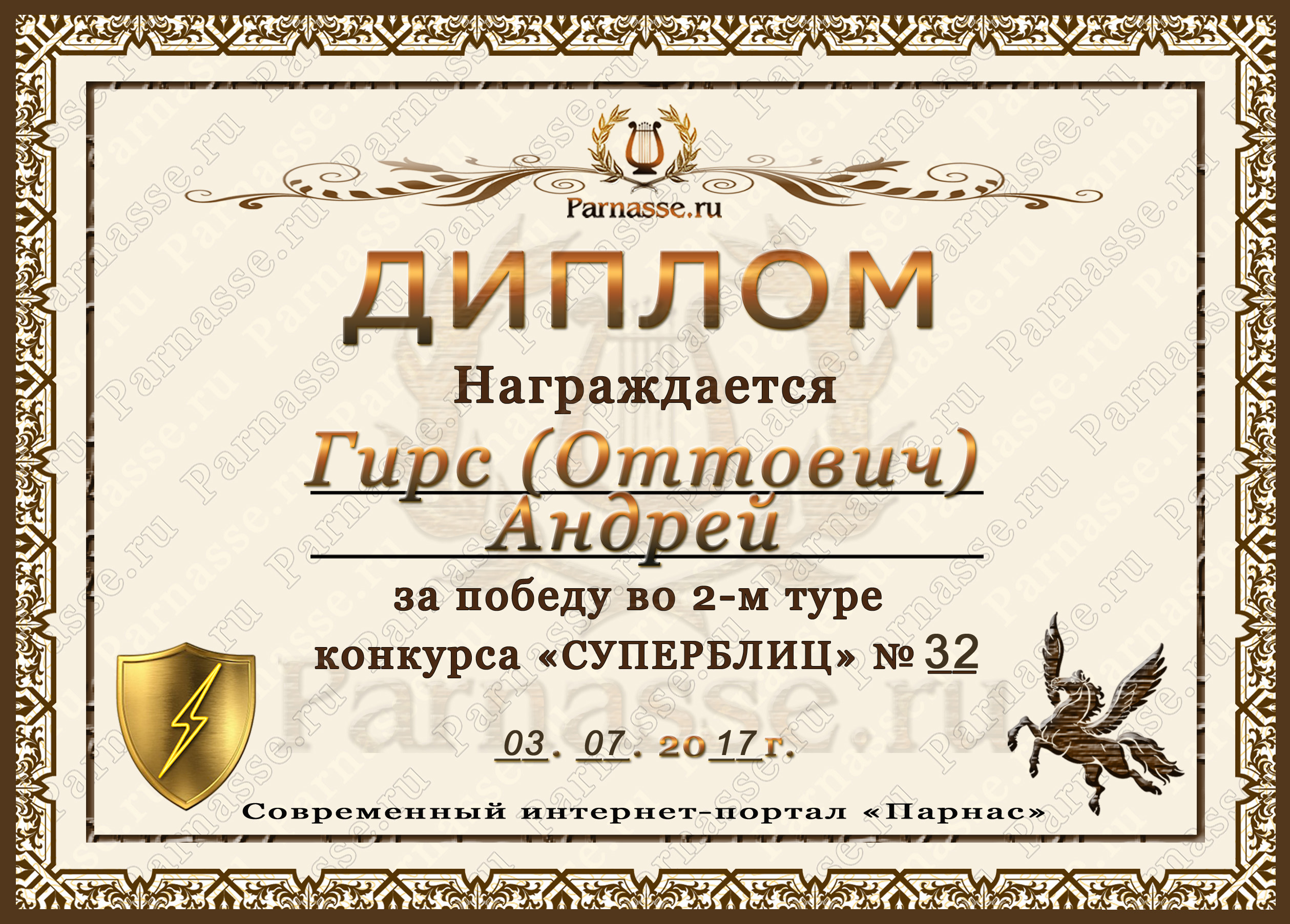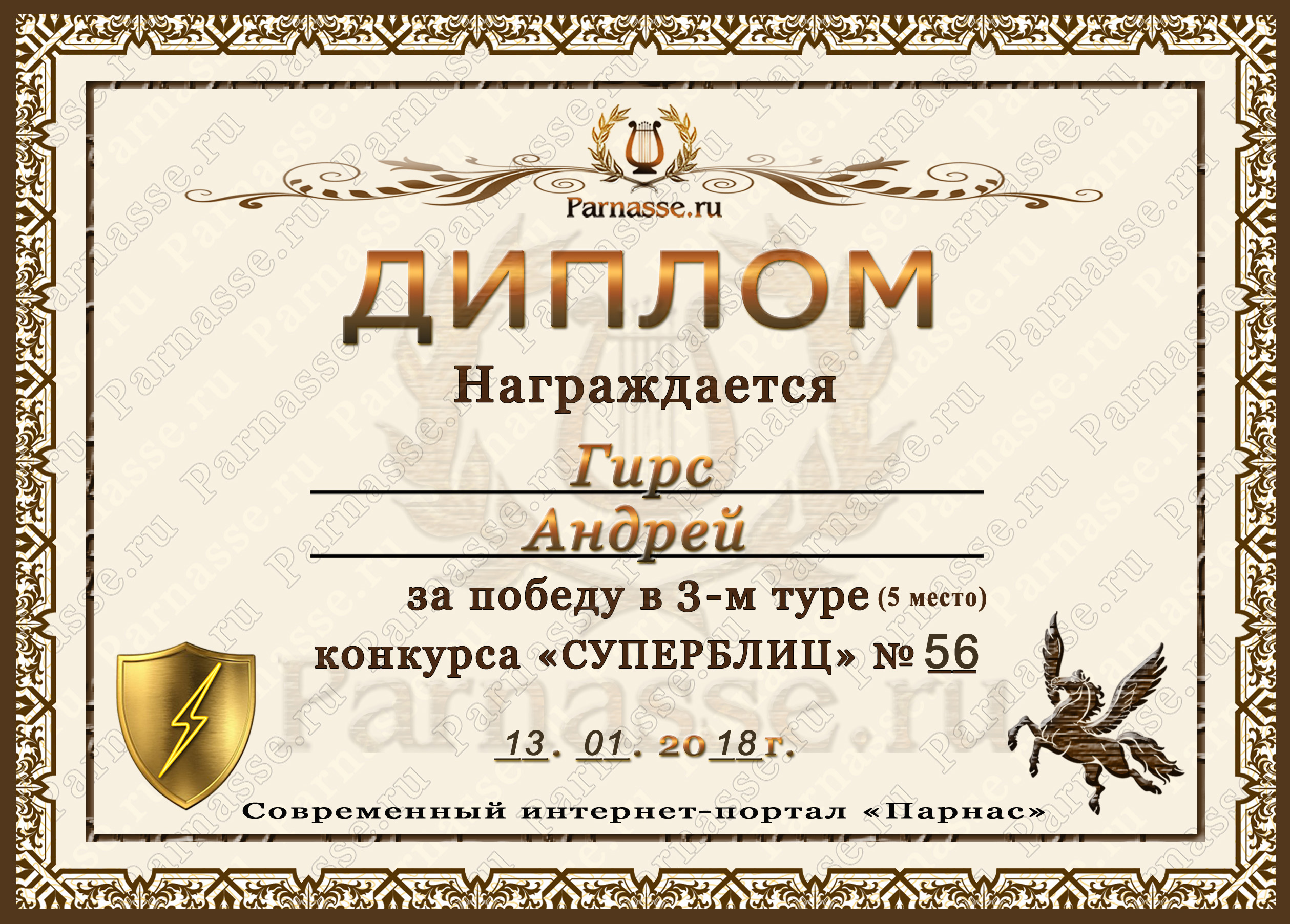 Диплом за 3 место во 2 туре (лимерики) в конкурсе СУПЕРБЛИЦА № 27!ПОЗДРАВЛЯЮ!