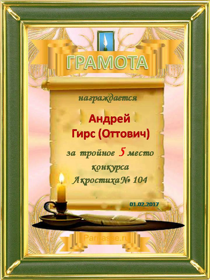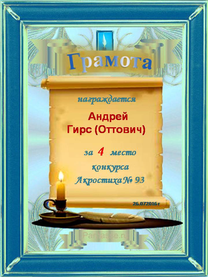 Грамота за 4 место в 104 конкурсе АКРОСТИХА (Альтернатива)! ПОЗДРАВЛЯЮ!