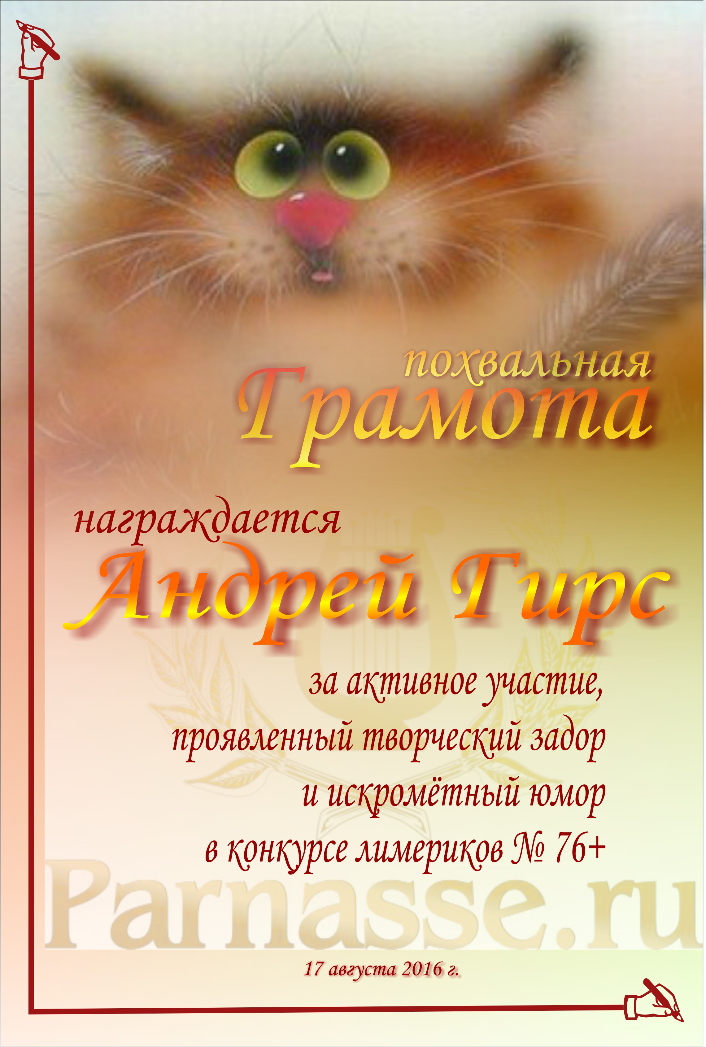 Похвальная грамота за активное участие в конкурсе лимериков № 76+ (17.08.2016 г.)