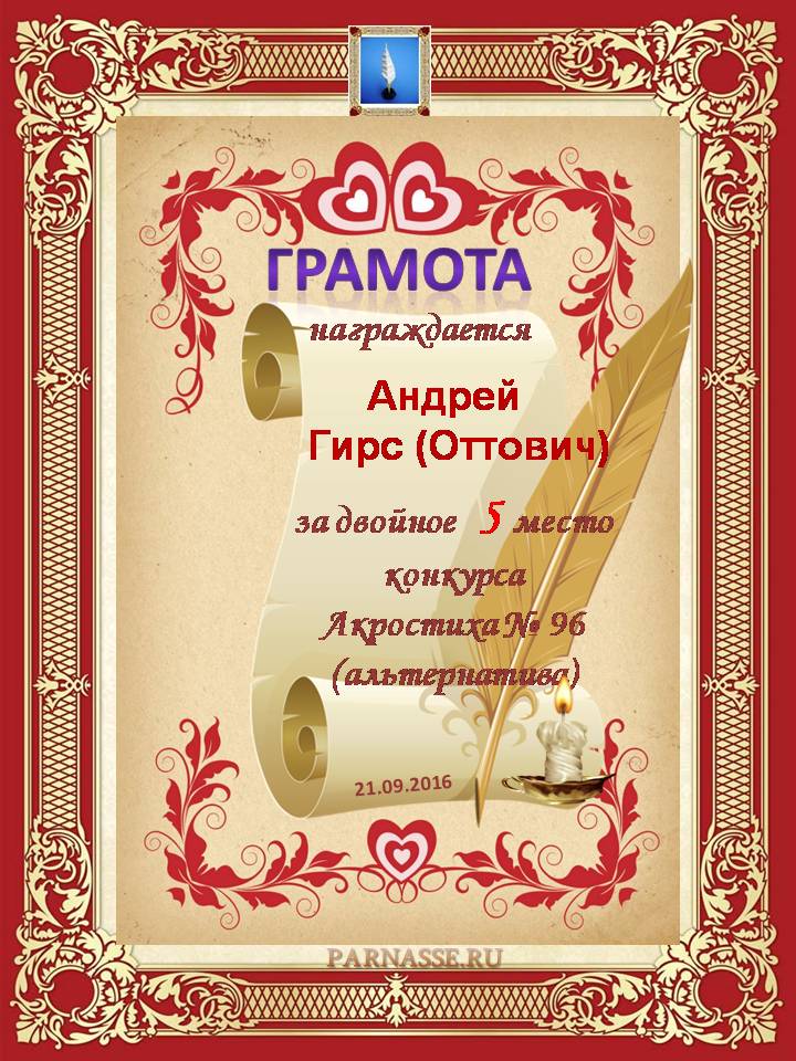Грамота за двойное 5 место в 96 конкурсе АКРОСТИХА (Альтернатива)! ПОЗДРАВЛЯЮ!