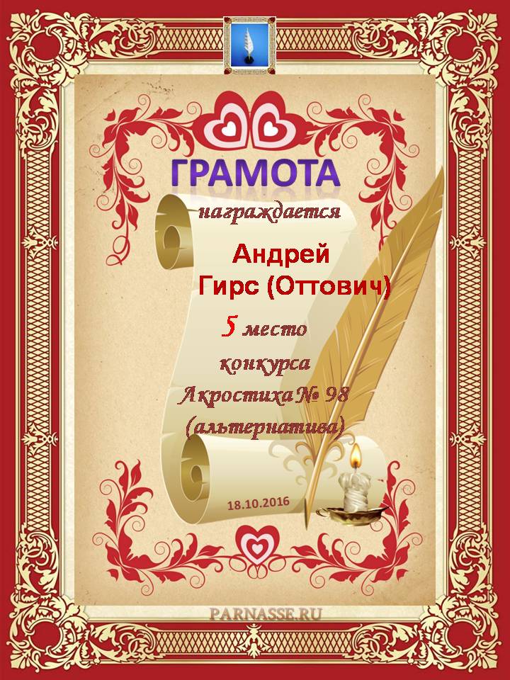 Грамота за 5 место в 98 конкурсе АКРОСТИХА (Альтернатива)! ПОЗДРАВЛЯЮ!