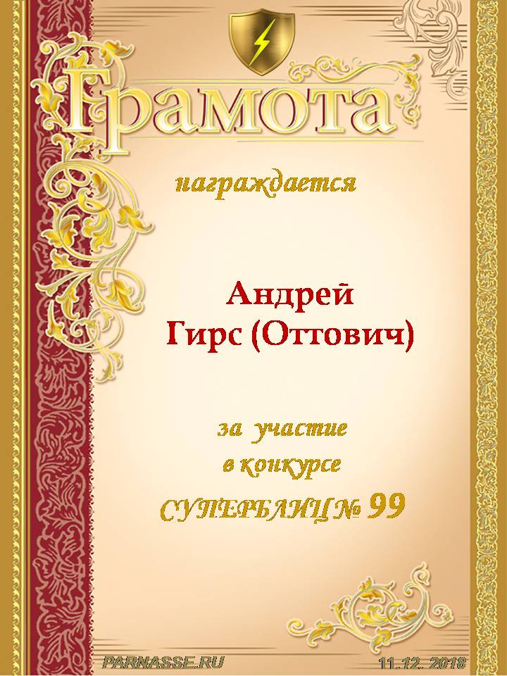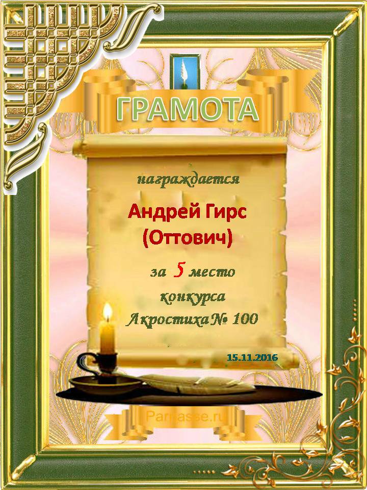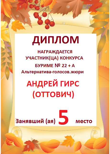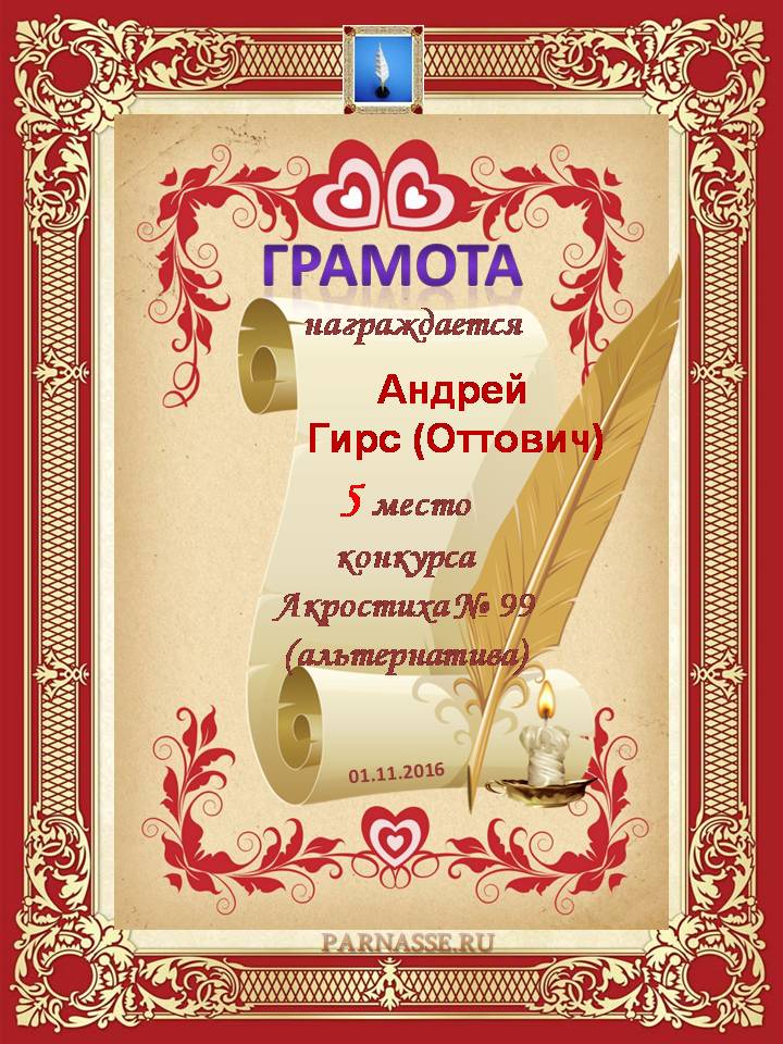Грамота за 5 место в 99 конкурсе АКРОСТИХА (Альтернатива)! ПОЗДРАВЛЯЮ!