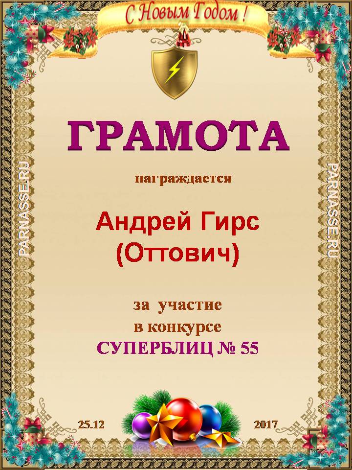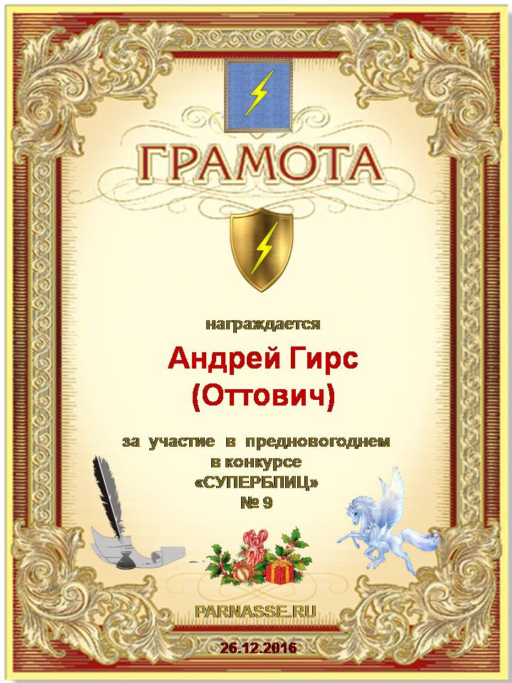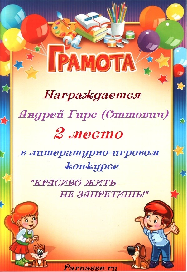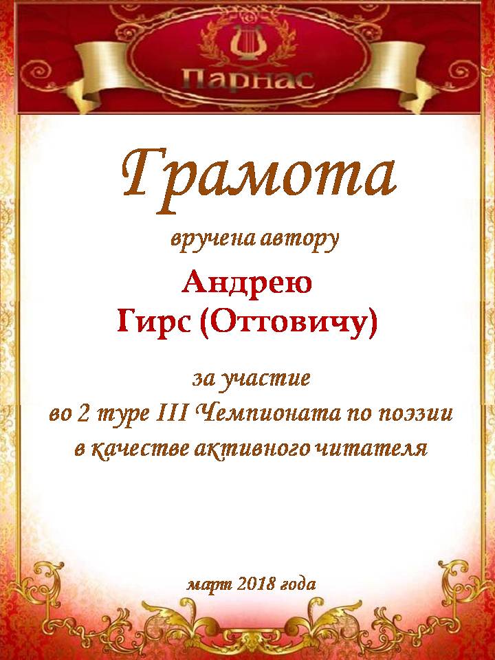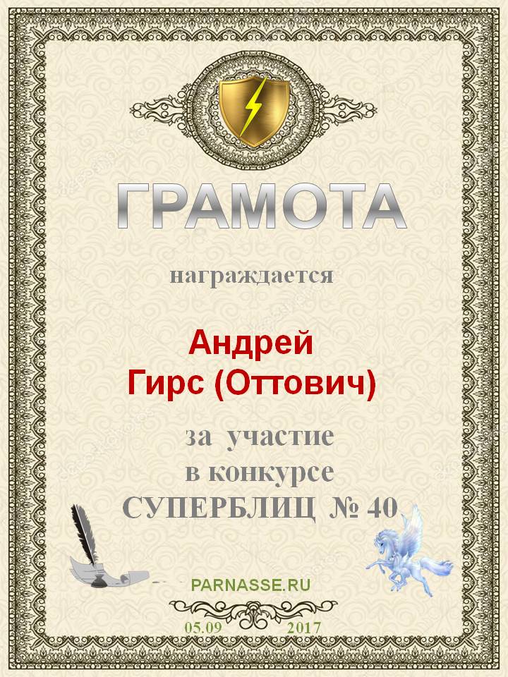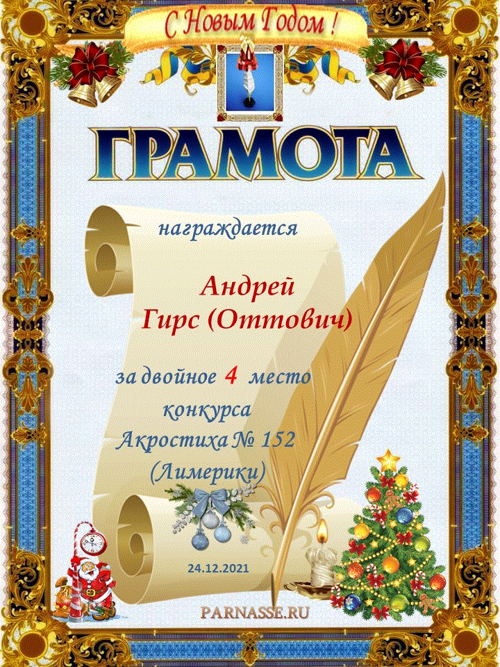 Грамота за двойное 4 место в 152 конкурсе АКРОСТИХА (Альтернатива - лимерики)