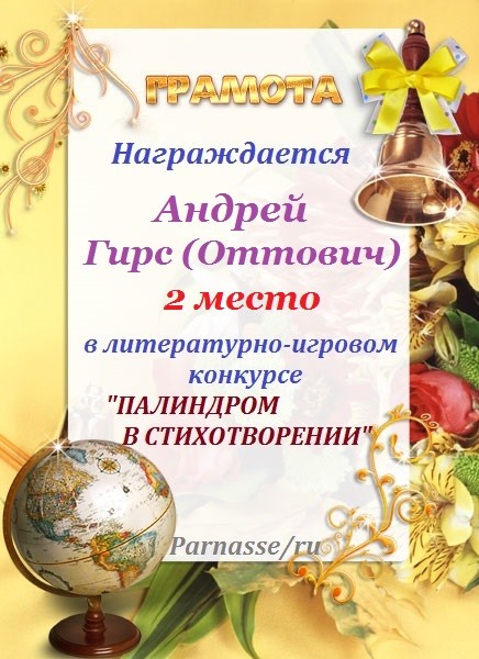 Победителю игрового конкурса:"Палиндром в стихотворении".