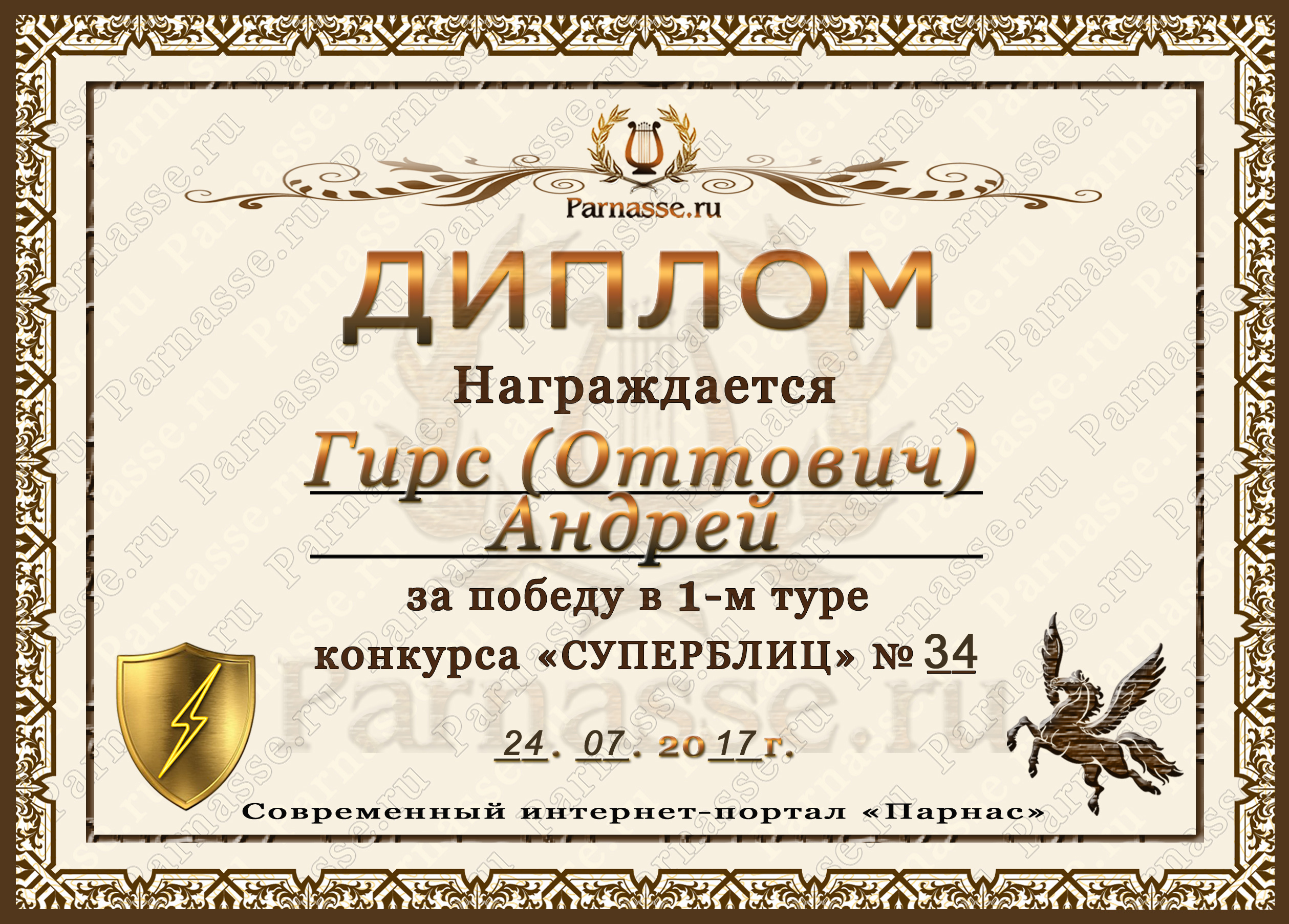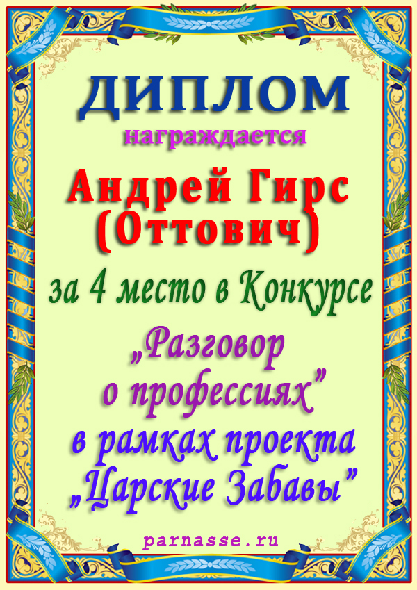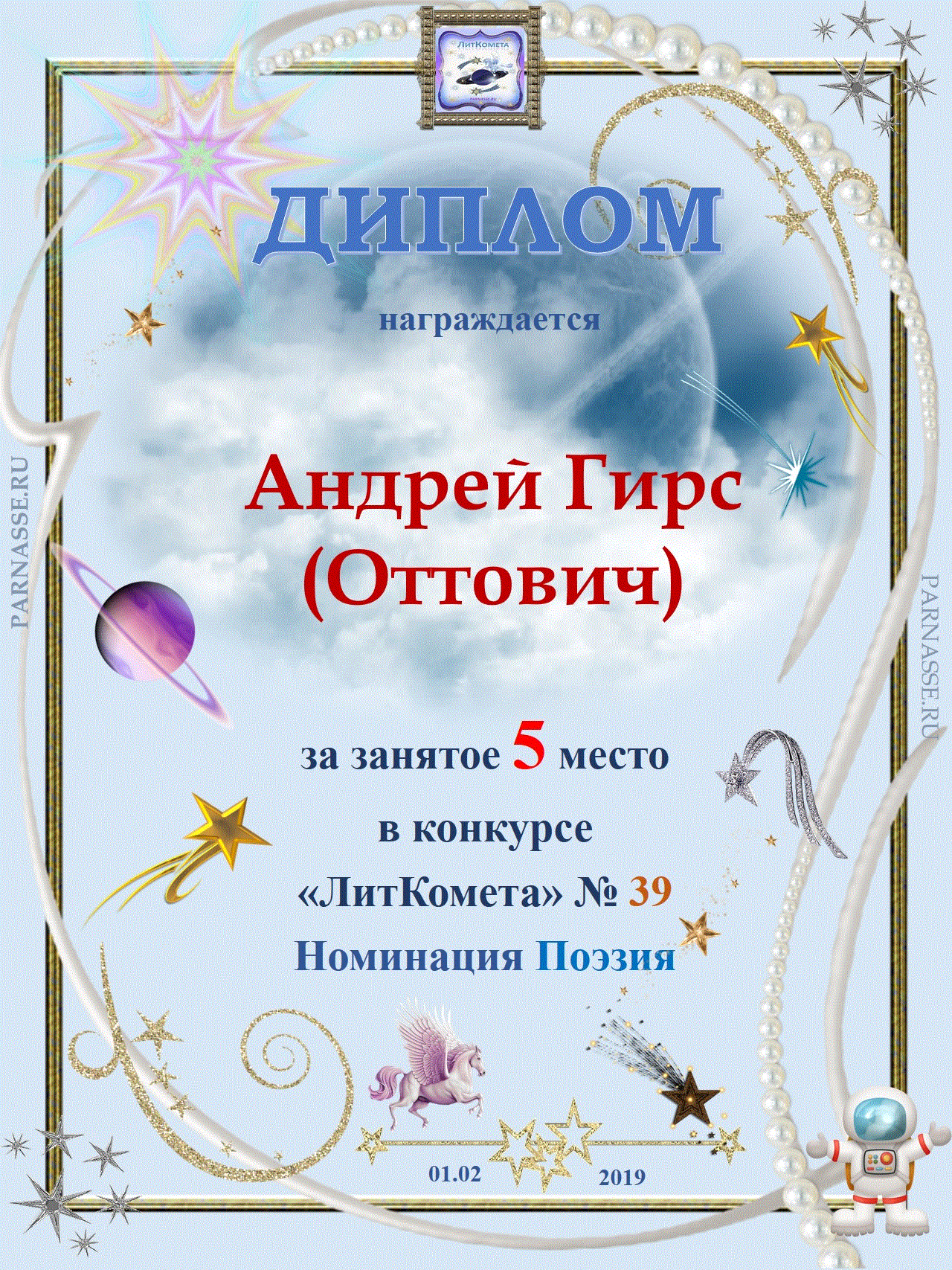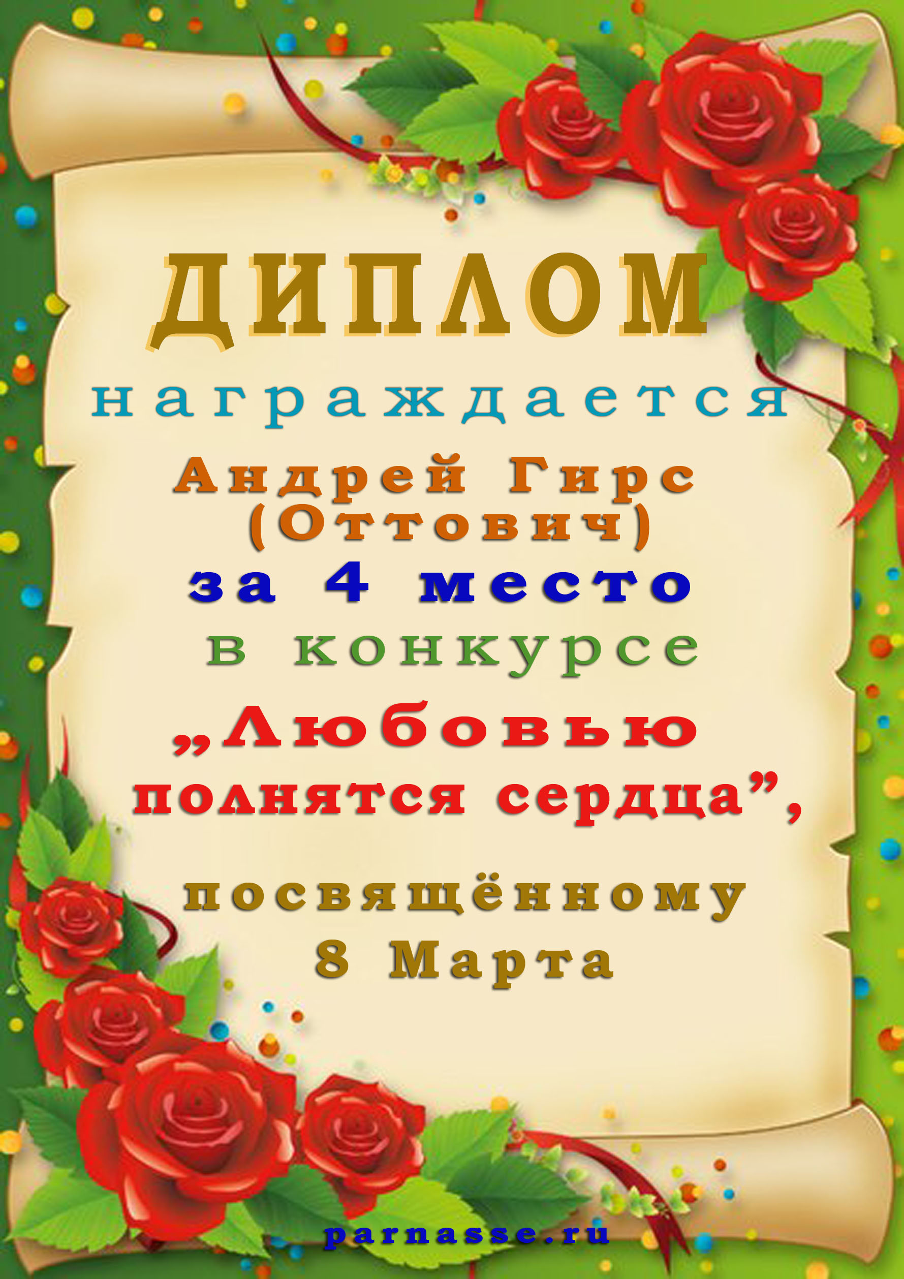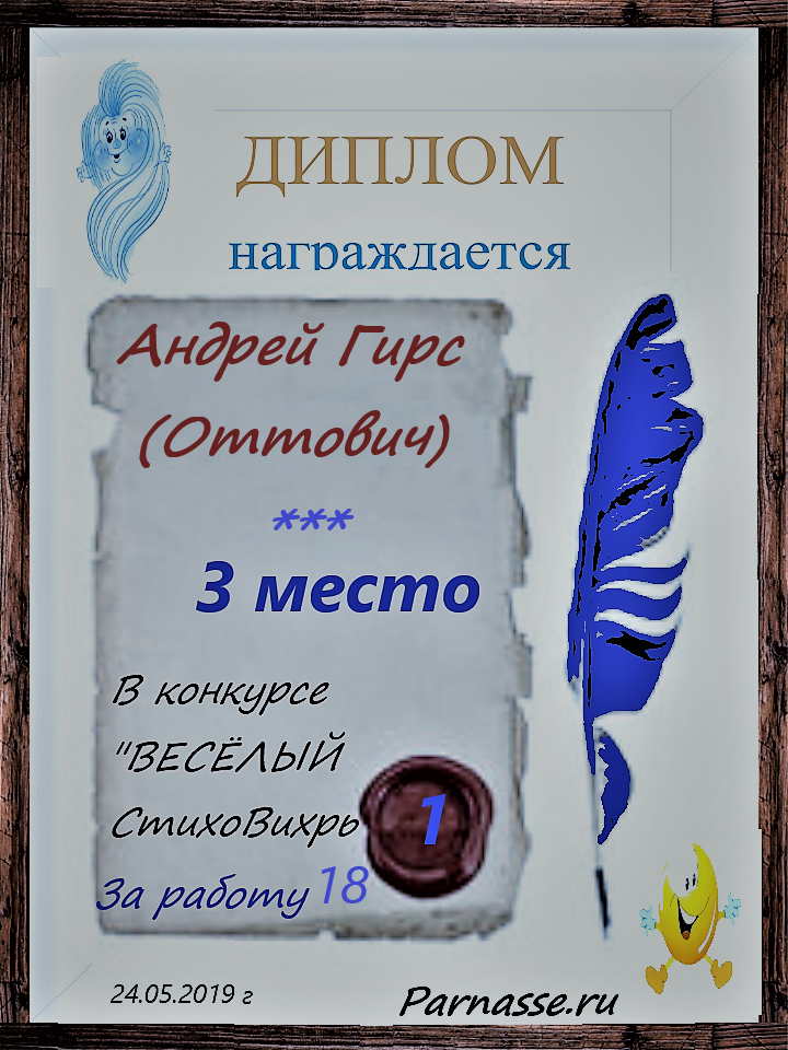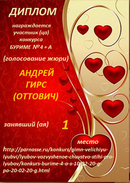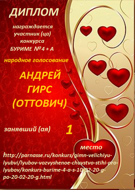Диплом за 1 место в 106 конкурсе АКРОСТИХА (Альтернатива)! ПОЗДРАВЛЯЮ!