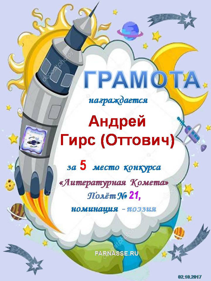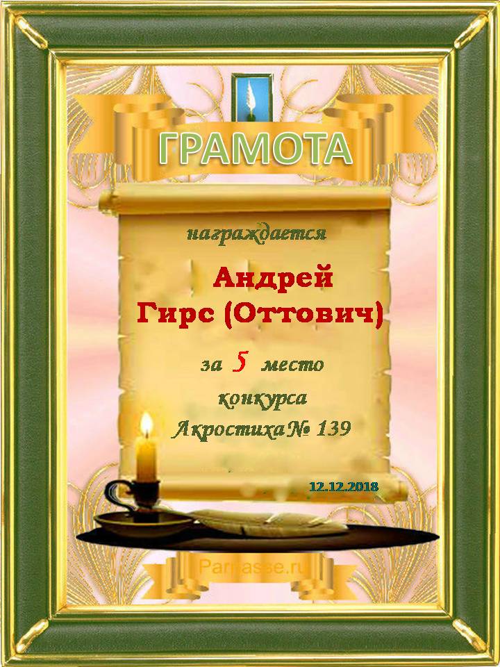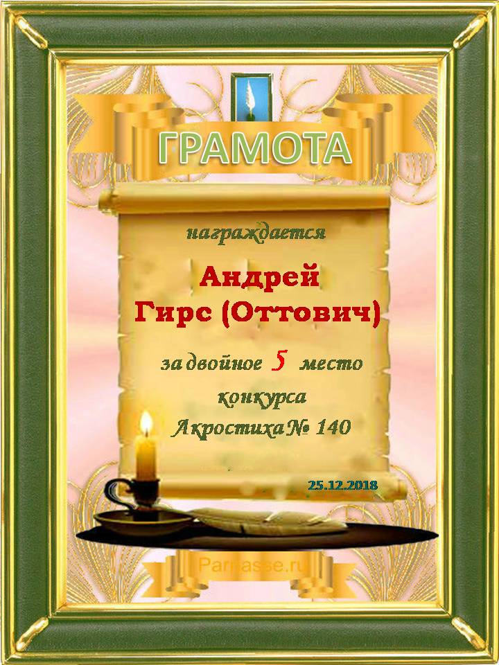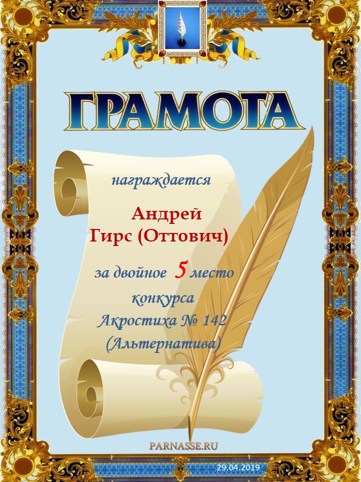 Грамота за 5 место в 140 конкурсе АКРОСТИХА (Альтернатива)! ПОЗДРАВЛЯЮ!
