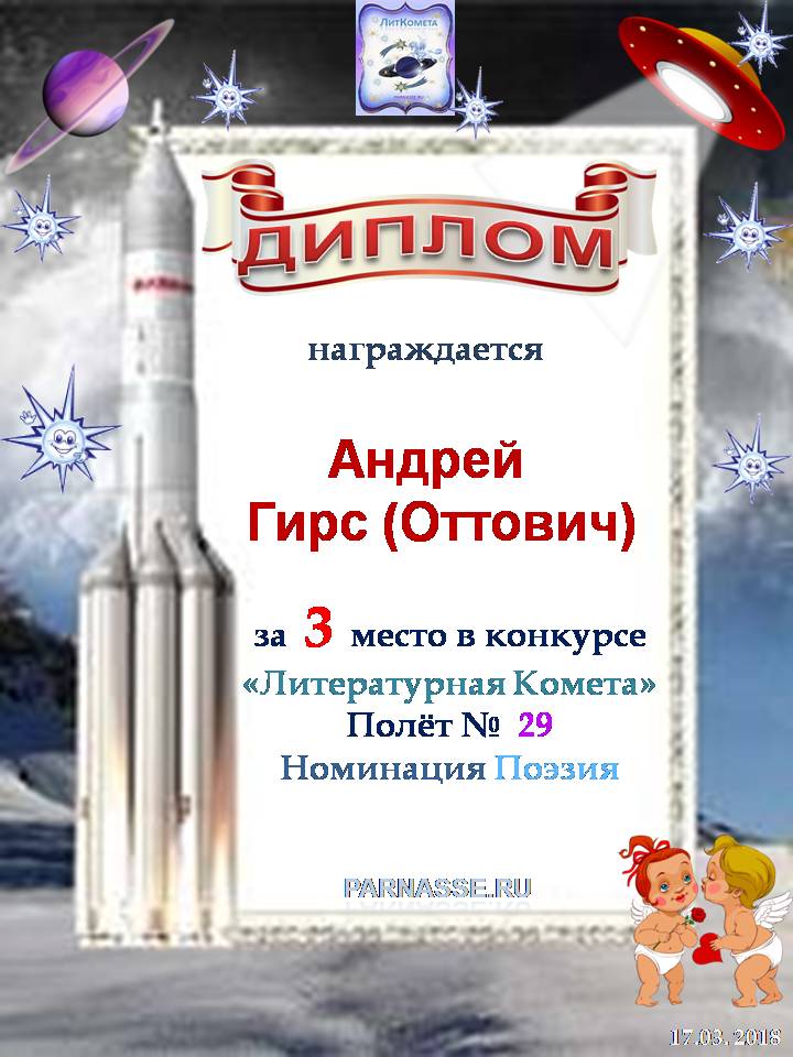 Поздравляю с 3 местом в конкурсе «ЛитКомета – Полёт № 29» - номинация Поэзия!