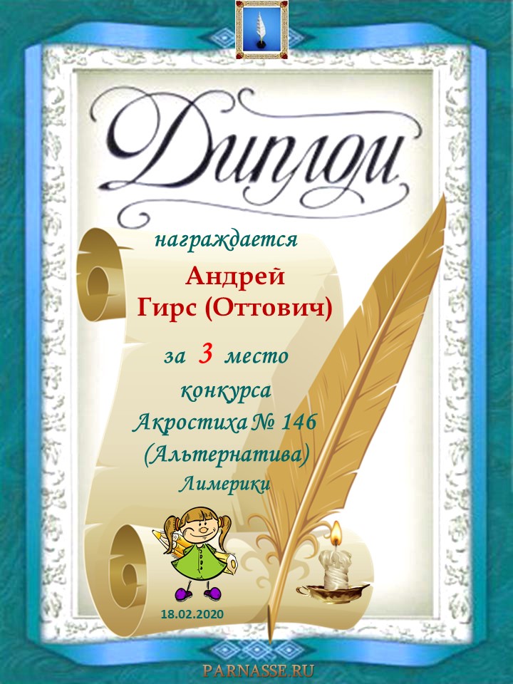 Диплом за 3 место в 146 конкурсе АКРОСТИХА (Альтернатива)! ПОЗДРАВЛЯЮ!