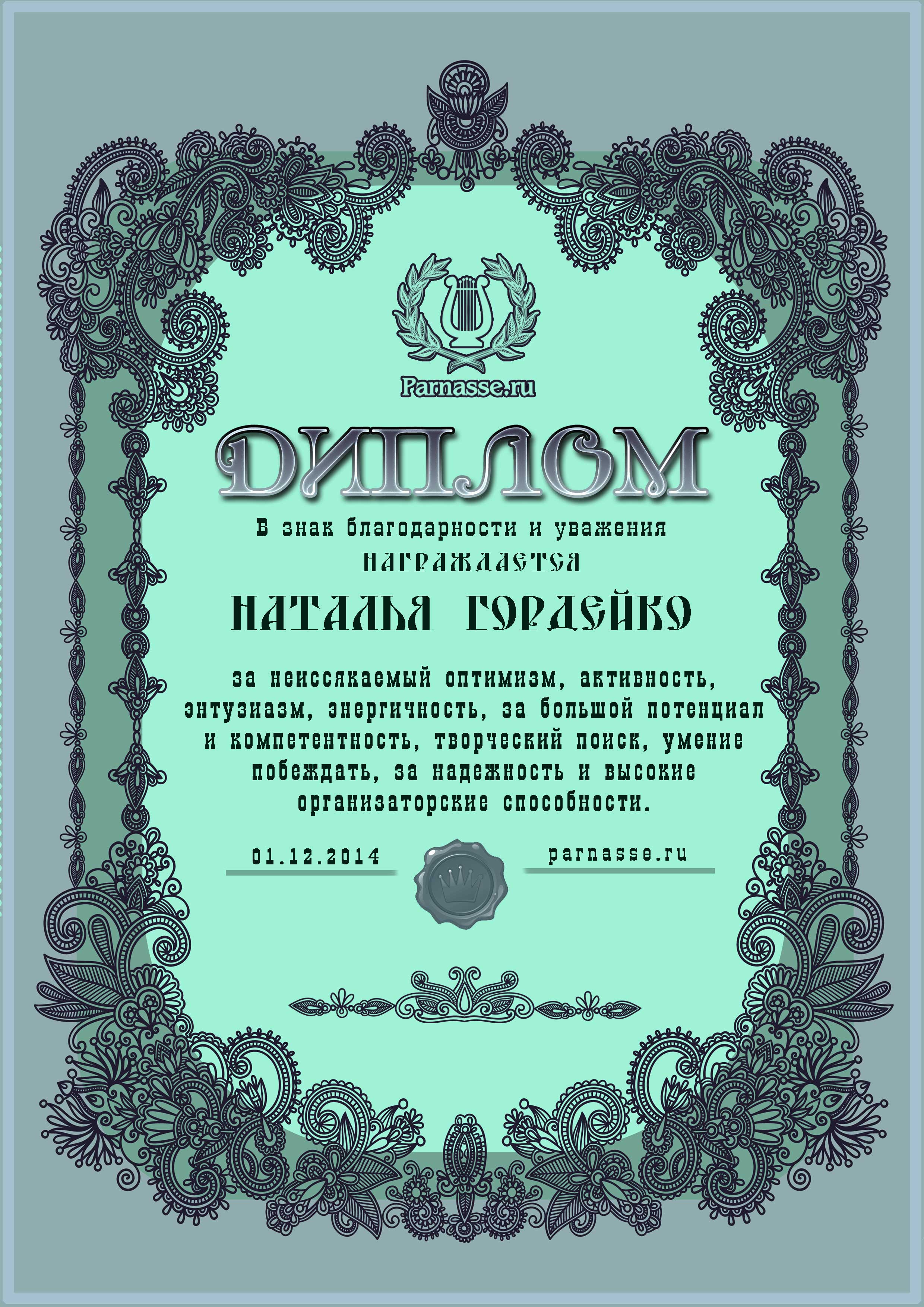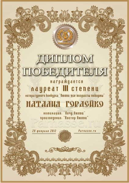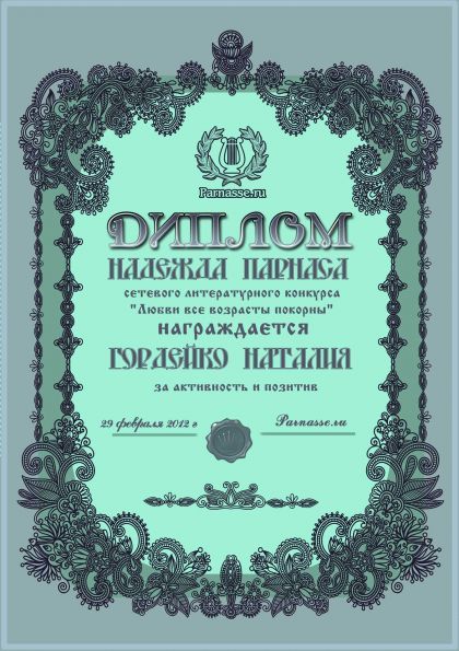 За неугасающую и неисчерпаемую творческую активность, постоянный контакт с Музой и признание сообществом "Парнасцев".От всей души желаем Вам, Наталия, здоровья, любви, успехов, благополучия, удачи и творческого вдохновения!
