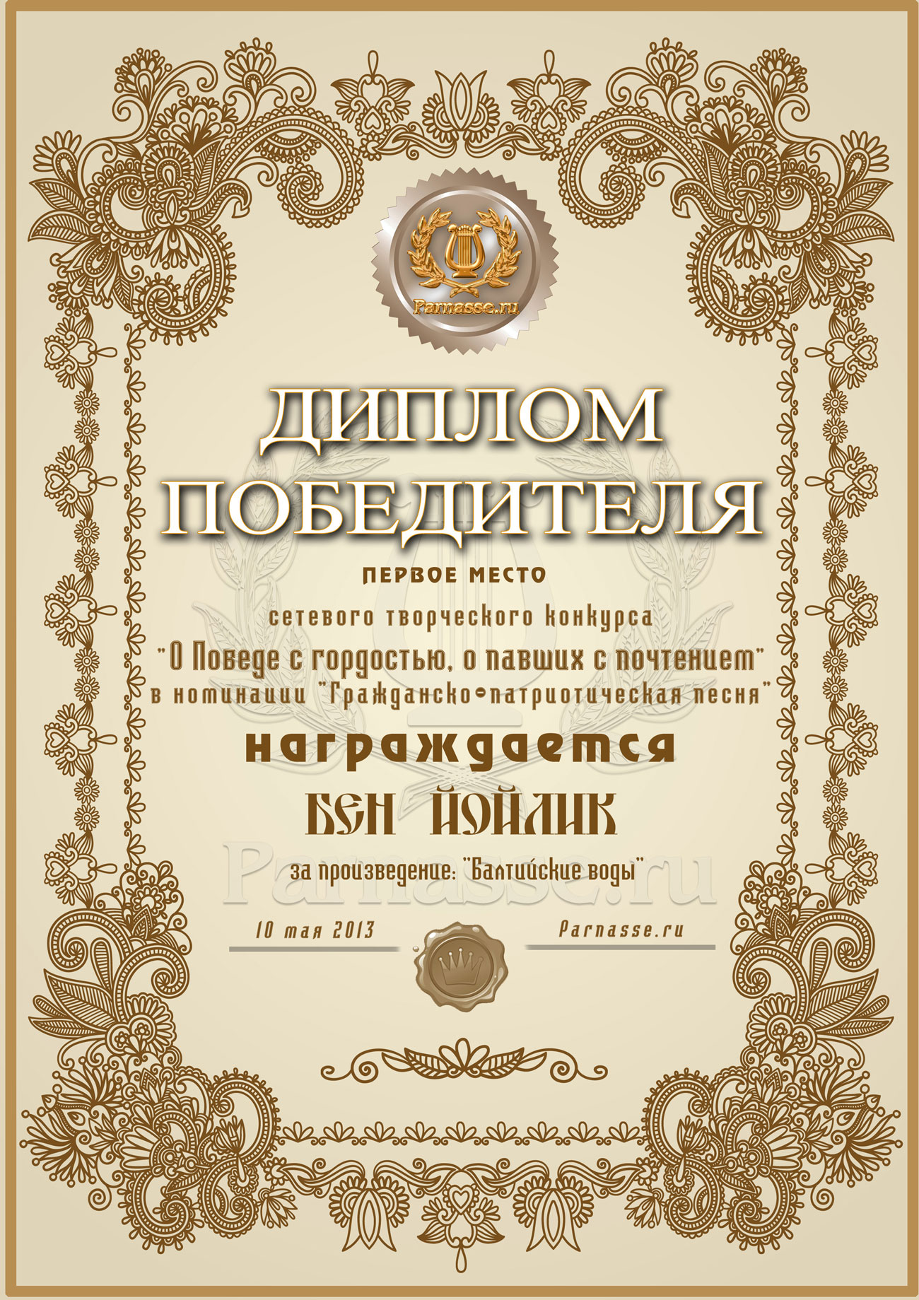 Первое место в музыкально-литературном конкурсе «О Победе с гордостью, о павших – с почтением!» Номинация «Песня гражданско-патриотической тематики»! Композитору песни «Балтийские воды»! Поздравляем с блестящей Победой в конкурсе!