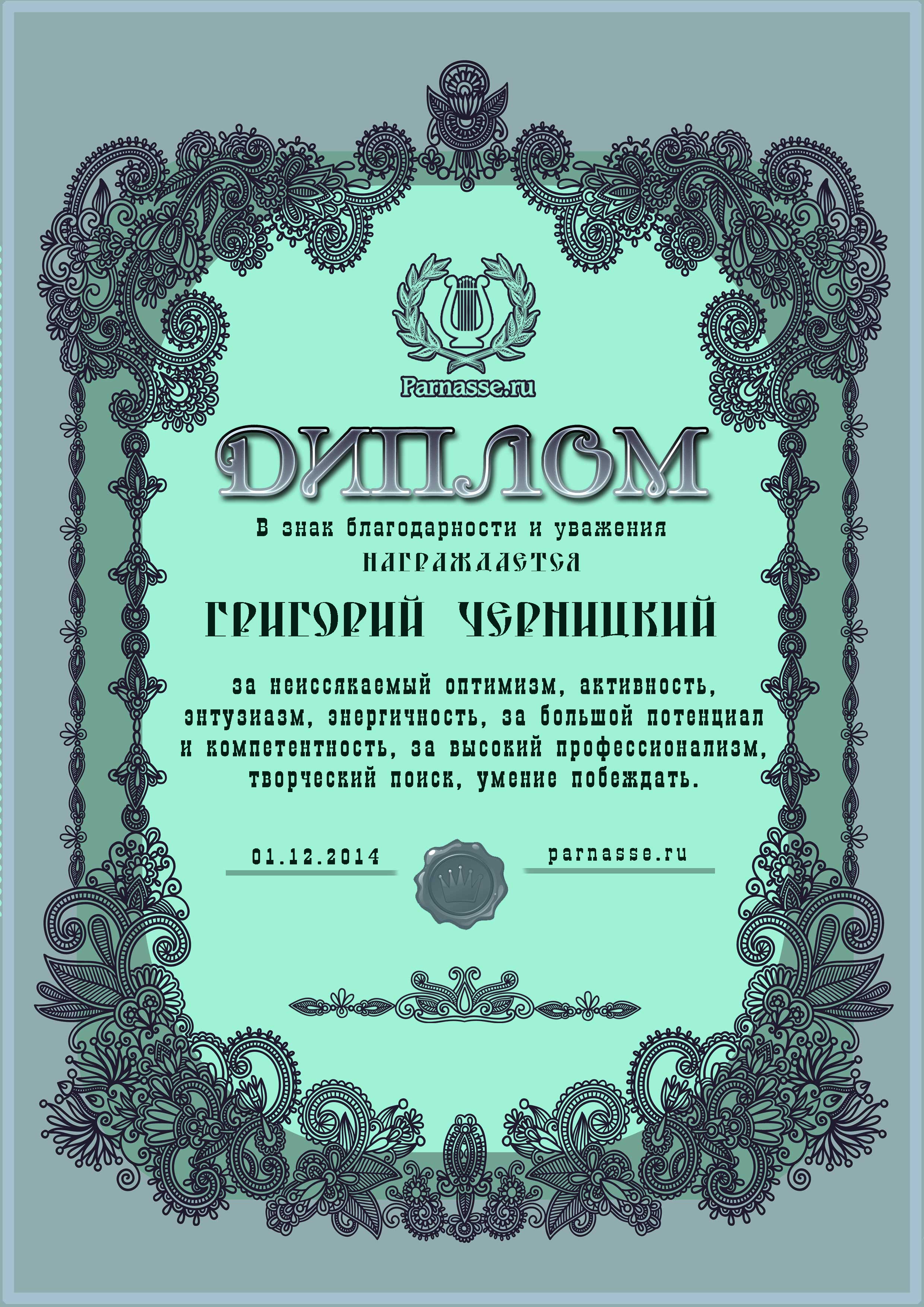 За неугасающую и неисчерпаемую творческую активность, постоянный контакт с Музой и признание сообществом "Парнасцев".От всей души желаем Вам, Григорий, здоровья, любви, успехов, благополучия, удачи и творческого вдохновения!