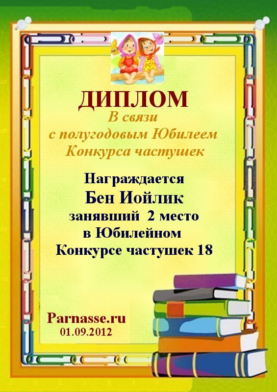 Третье место в музыкально-литературном конкурсе «Если друг оказался вдруг»! Номинация «Проза»! Произведение «Баня, башня, друзья и сосед»! Поздравляем с достойной победой, Дорогой Бен! Спасибо за активное участие в конкурсе!
