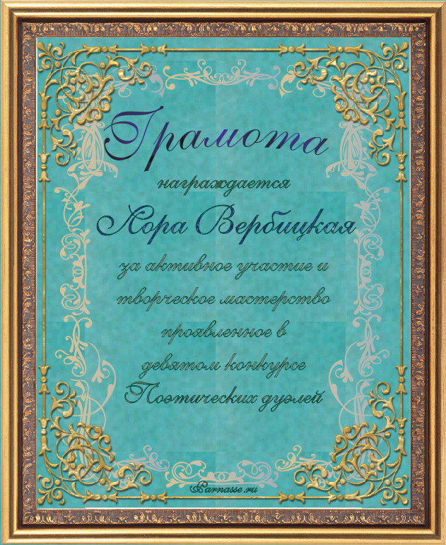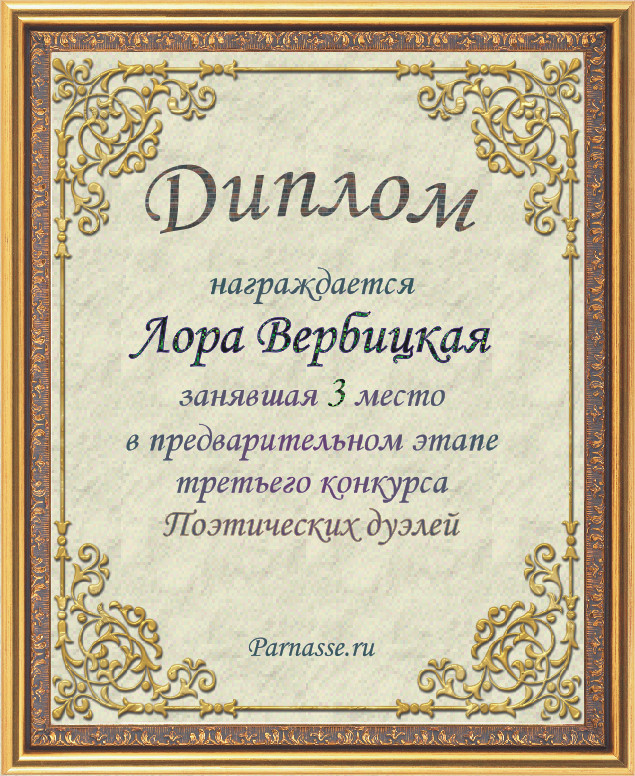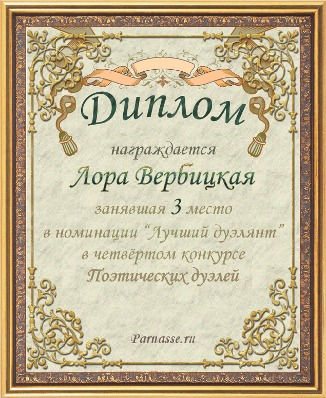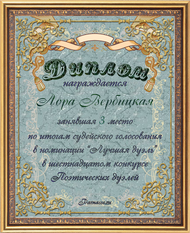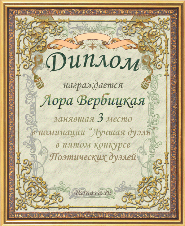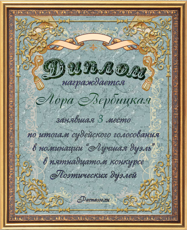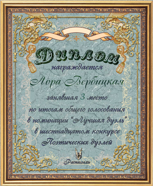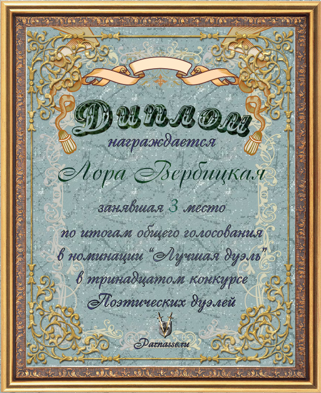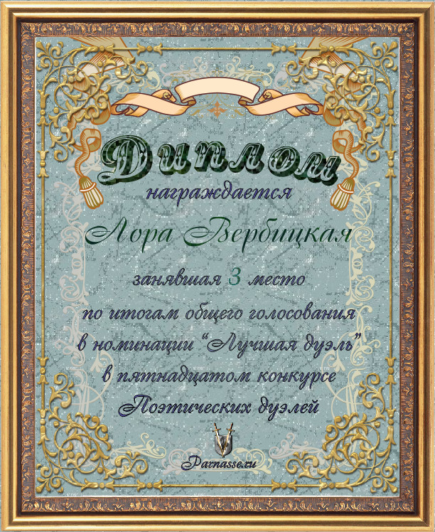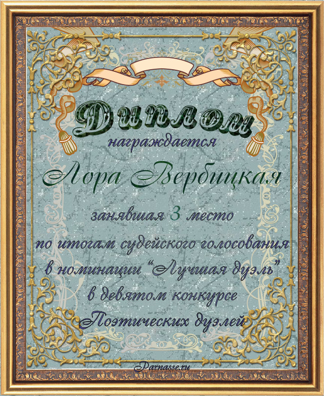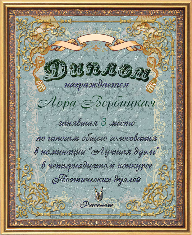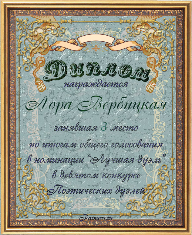 Диплом за 3-е место в номинации "Лучшая дуэль" по итогам общего голосования в девятом конкурсе поэтических дуэлей(№ 13.2)