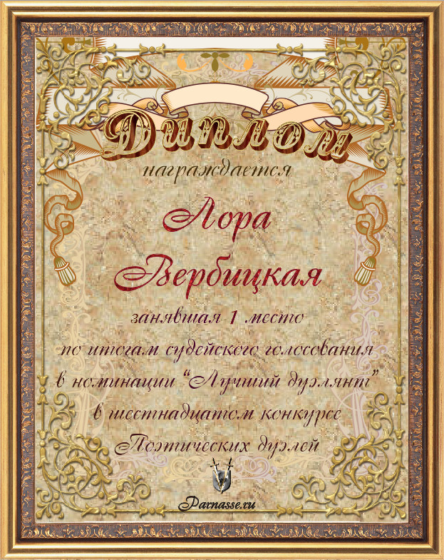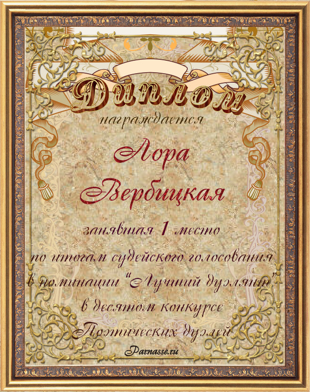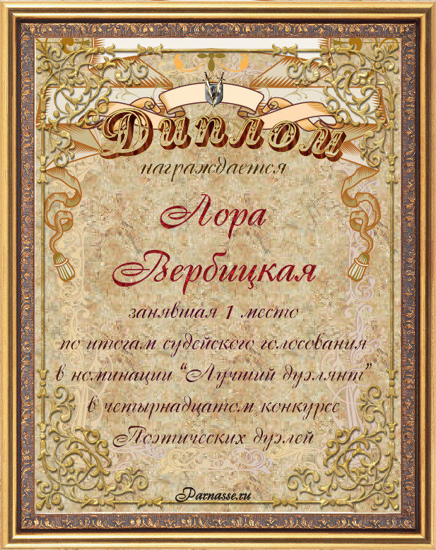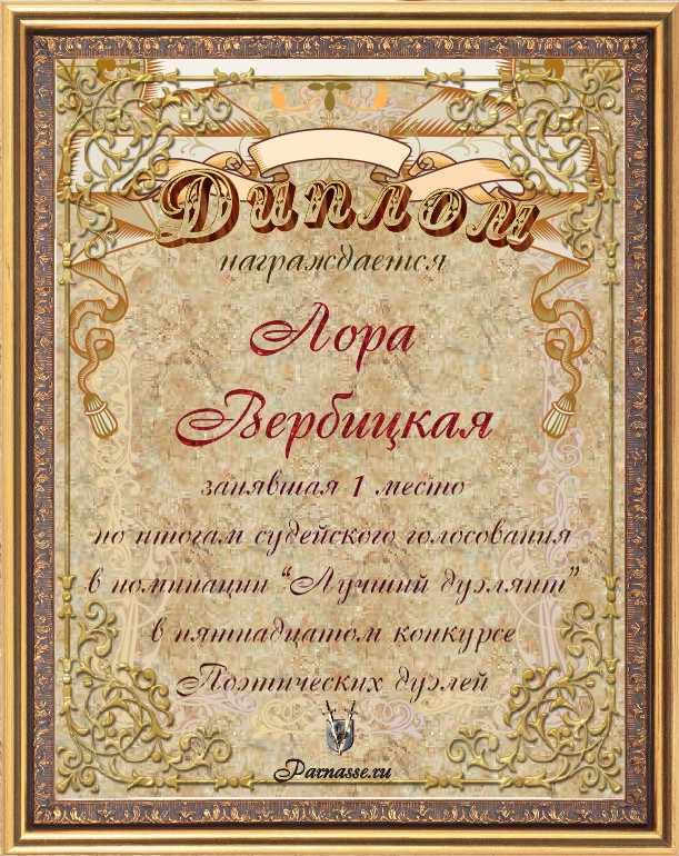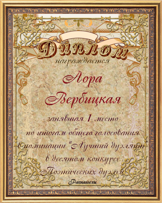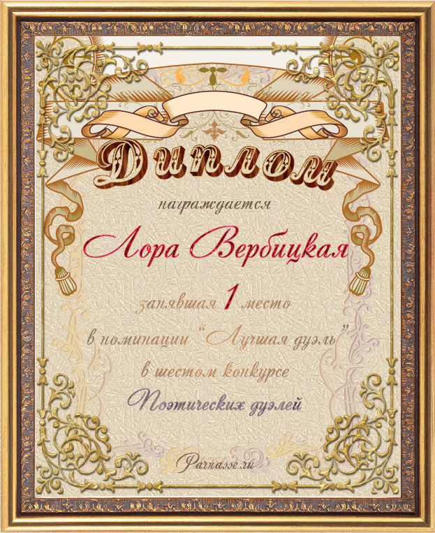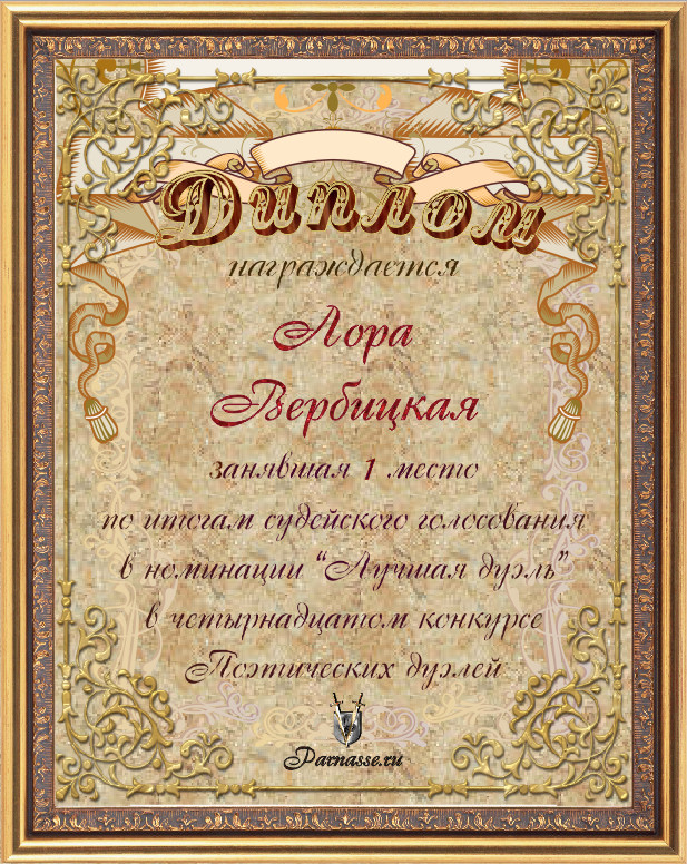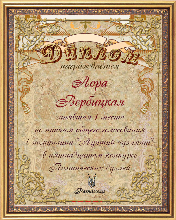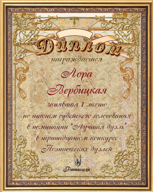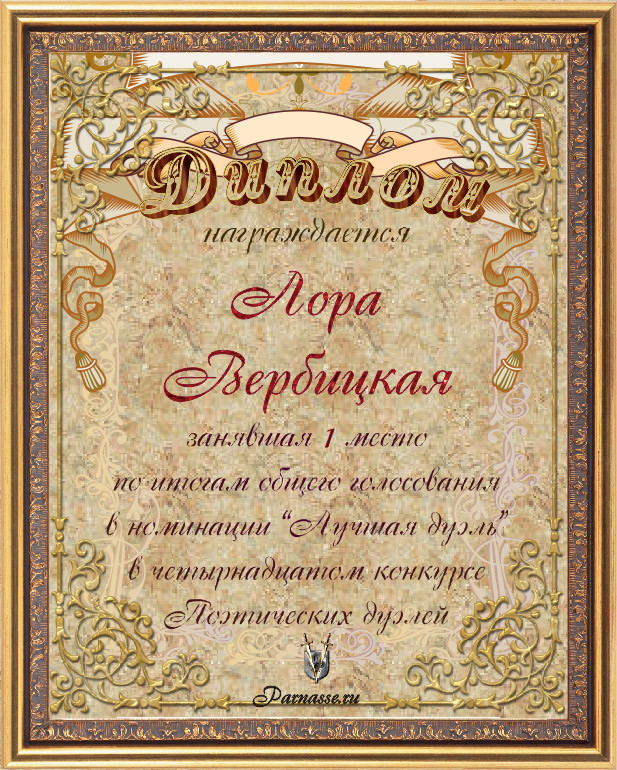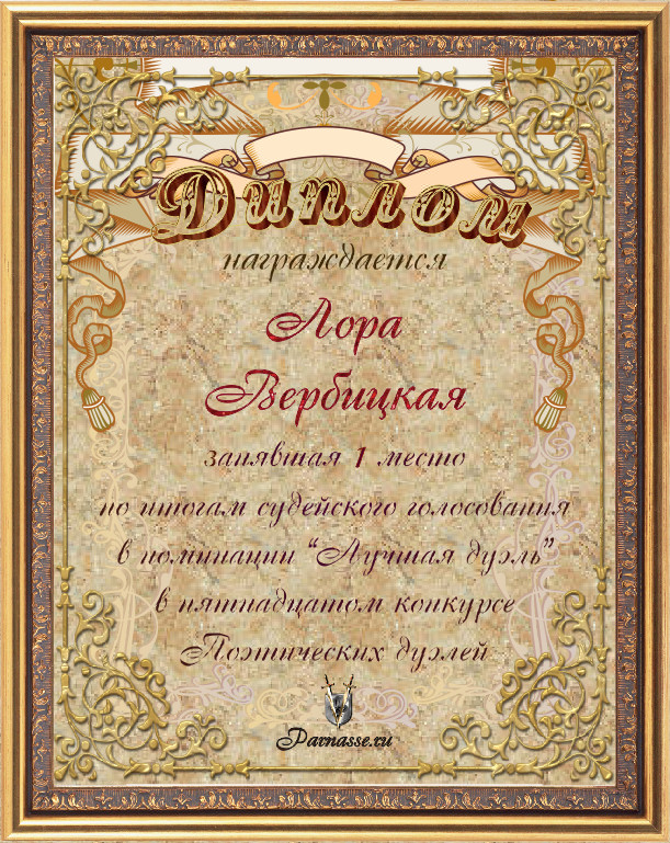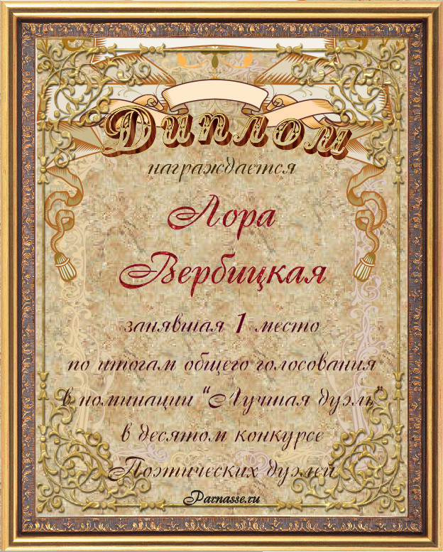 Диплом за 1-е место в номинации "Лучшая дуэль" по итогам общего голосования в десятом конкурсе поэтических дуэлей (№ 5.1)