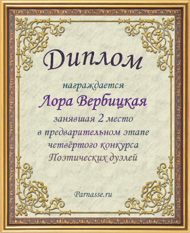 Диплом за второе место в предварительном этапе четвёртого конкурса Поэтических дуэлей.