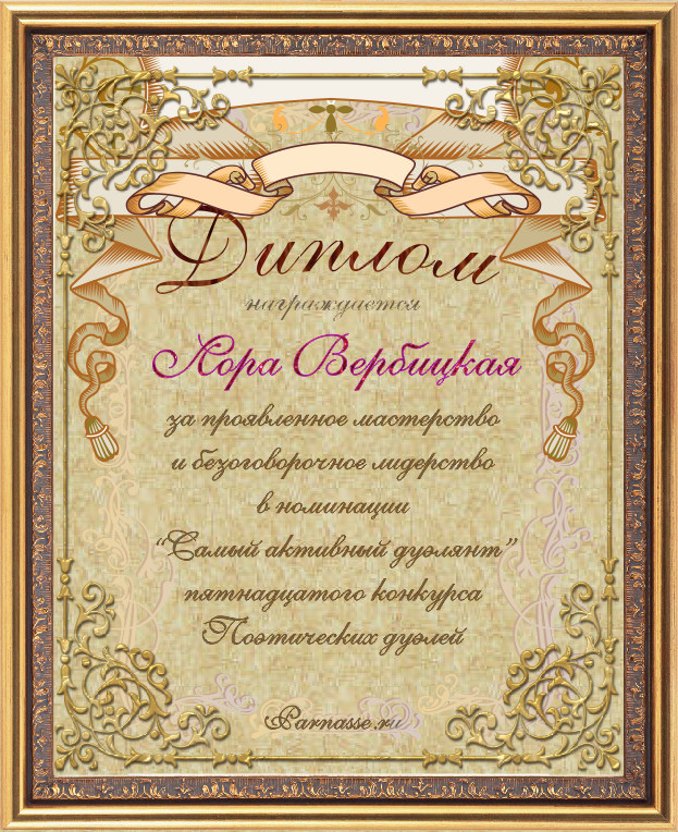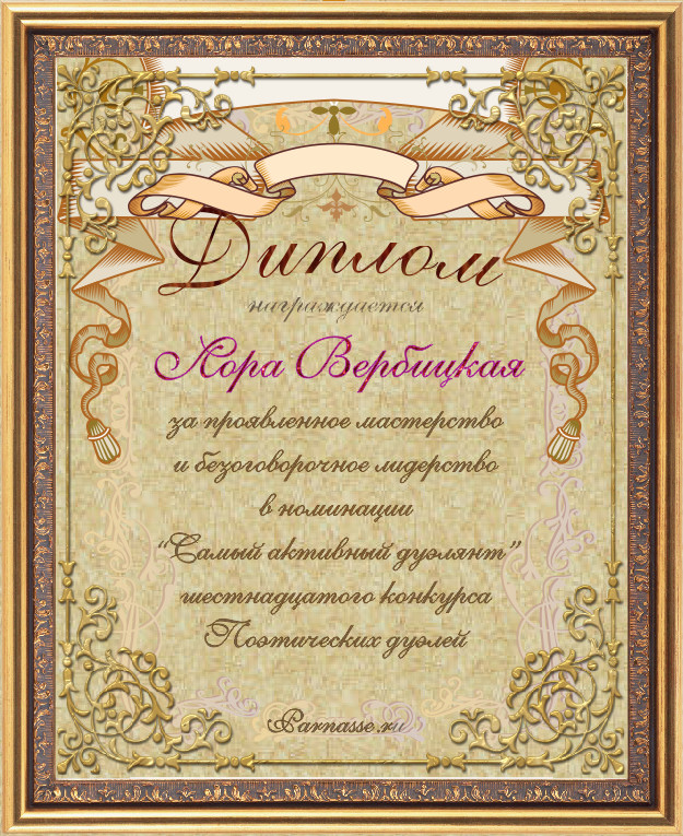 Диплом присуждён в номинации "Самый активный дуэлянт" одиннадцатого конкурса поэтических дуэлей