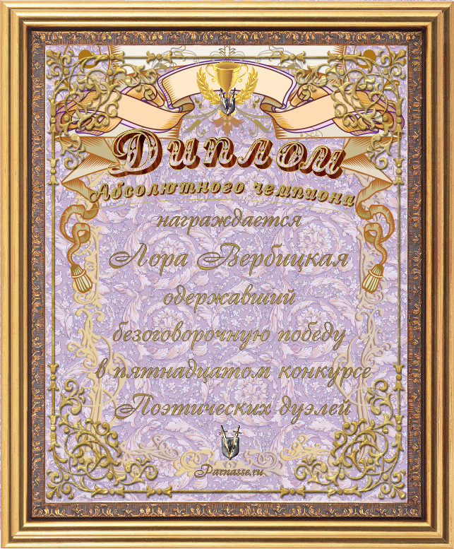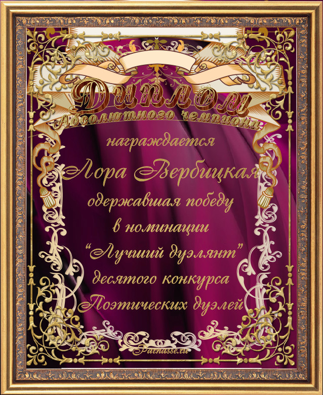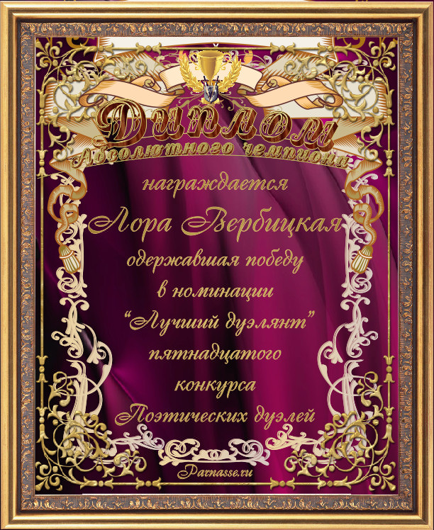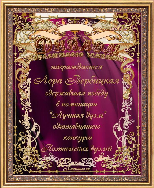 ЗА ПОБЕДУ В НОМИНАЦИЙ "ЛУЧШАЯ ДУЭЛЬ" 11го КОНКУРСА ПОЭТИЧЕСКИХ ДУЭЛЕЙ