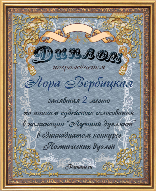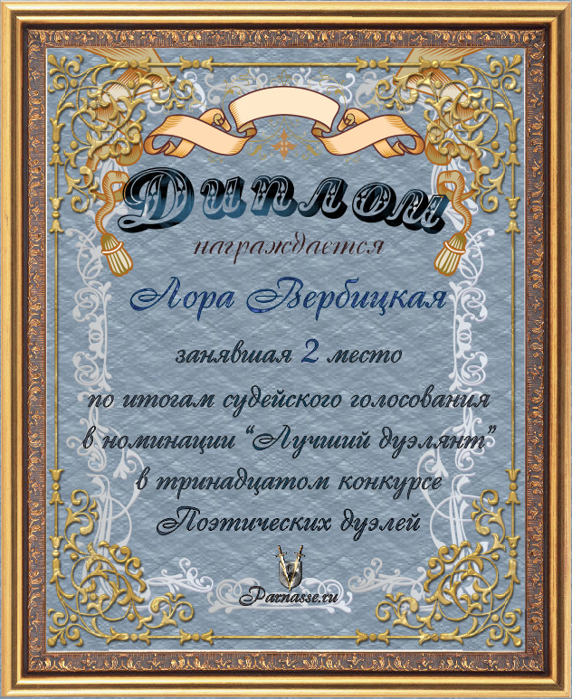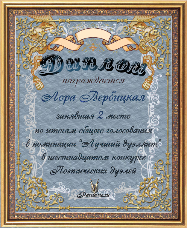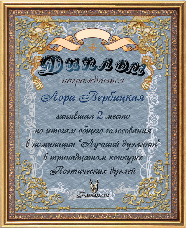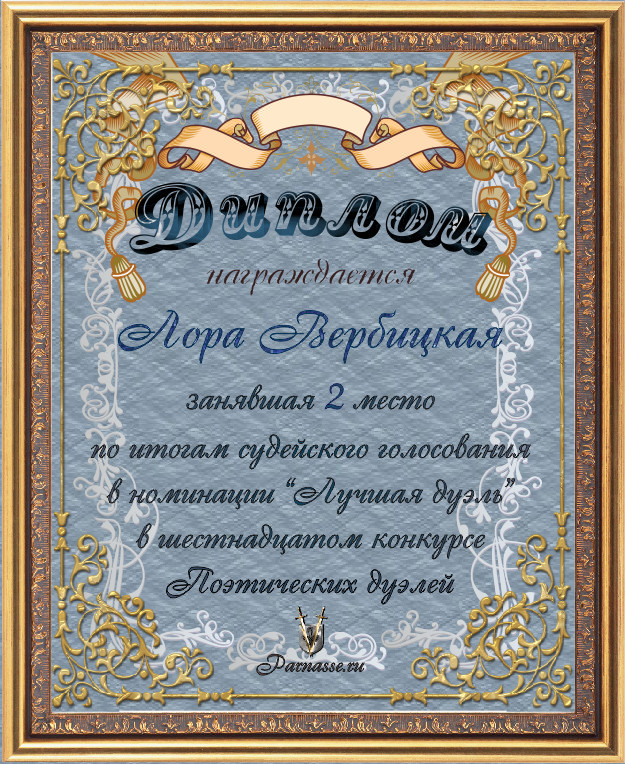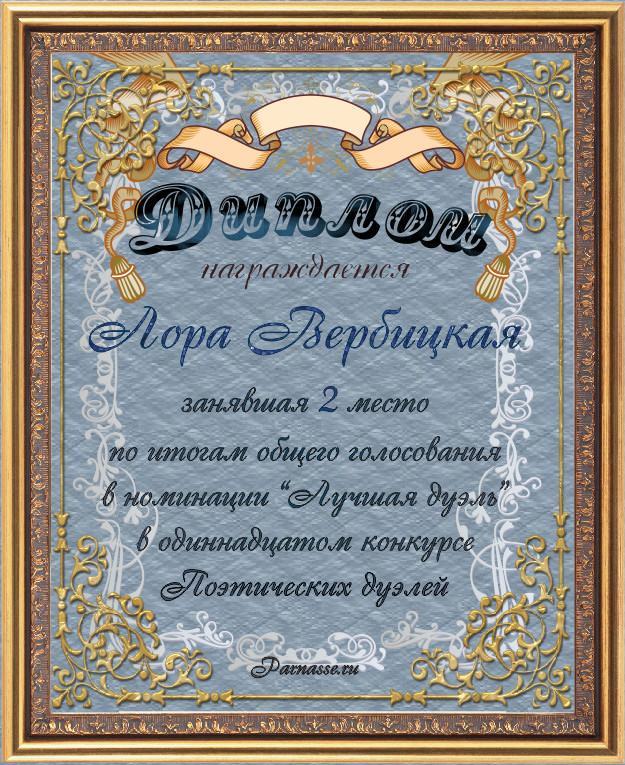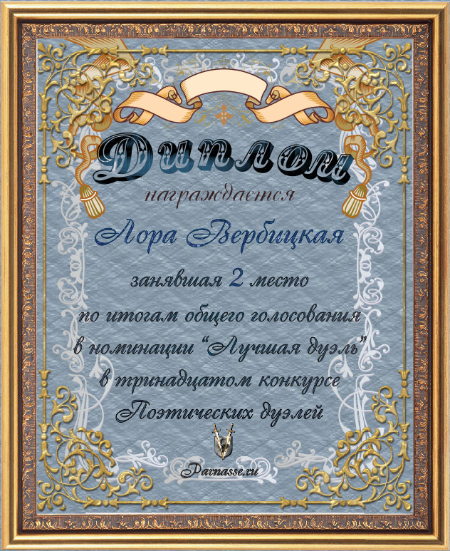 Диплом за 2-е место в номинации "Лучшая дуэль" по итогам общего голосования в одиннадцатом конкурсе поэтических дуэлей (№ 15.1)