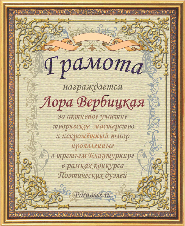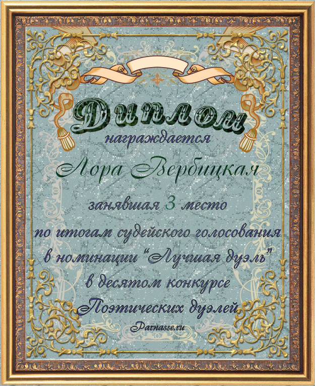 Диплом за 3-е место в номинации "Лучшая дуэль" по итогам судейского голосования в десятом конкурсе поэтических дуэлей(№ 17.1)