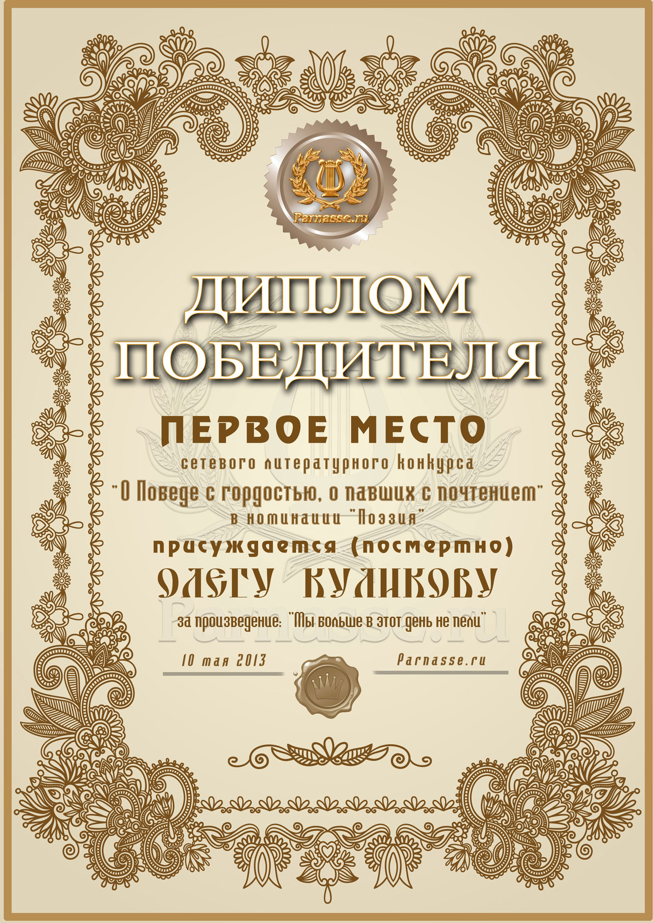 Диплом Олега Куликова - победителя конкурса "О Победе с гордостью, о павших с почтением"