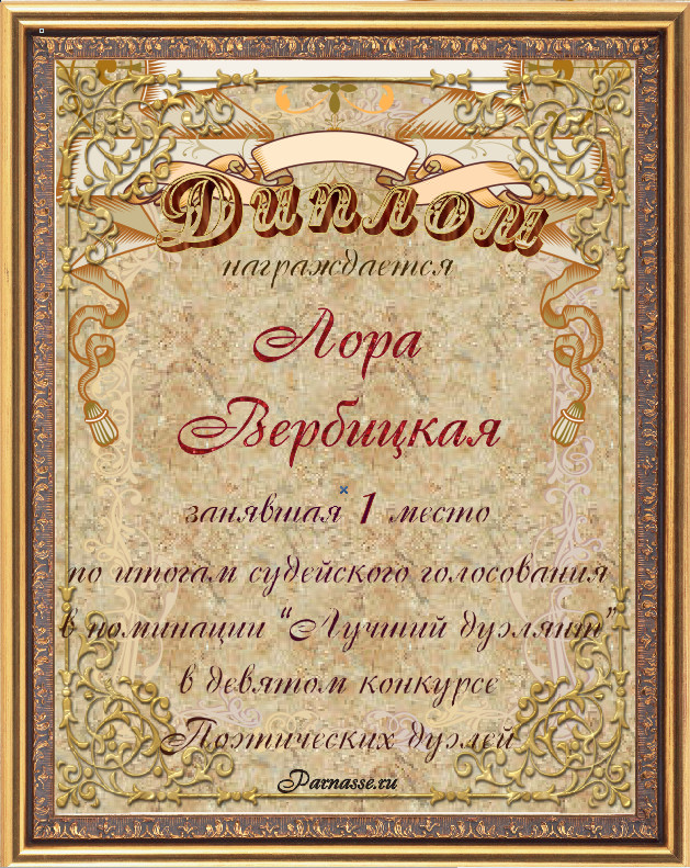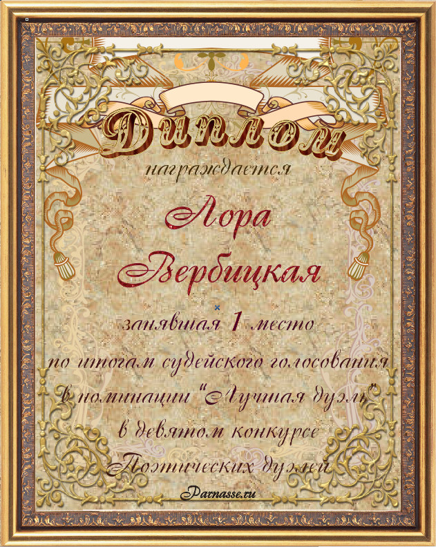 Диплом за 1-е место в номинации "Лучшая дуэль" по итогам судейского голосования в девятом конкурсе поэтических дуэлей(№ 21.1)