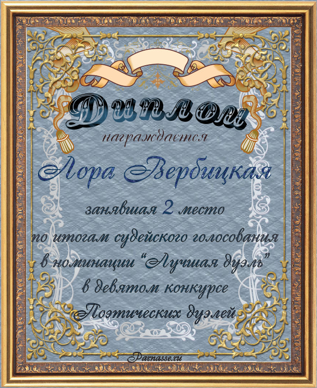 Диплом за 2-е место в номинации "Лучшая дуэль" по итогам судейского голосования в девятом конкурсе поэтических дуэлей(№ 15.1)
