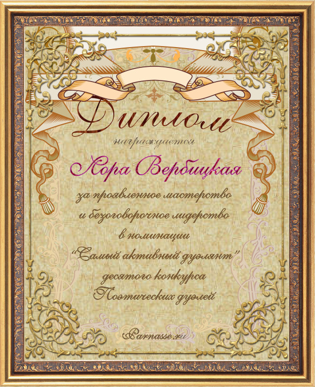 Диплом присуждён в номинации "Самый активный дуэлянт" десятого конкурса поэтических дуэлей