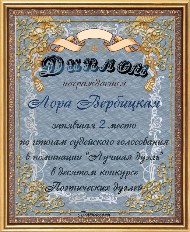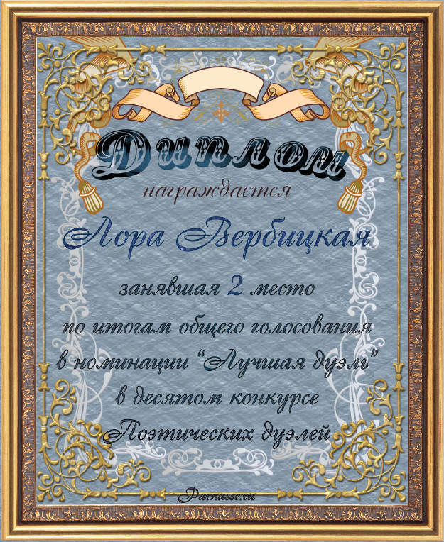 Диплом за 2-е место в номинации "Лучшая дуэль" по итогам общего голосования в десятом конкурсе поэтических дуэлей(№ 4.1)