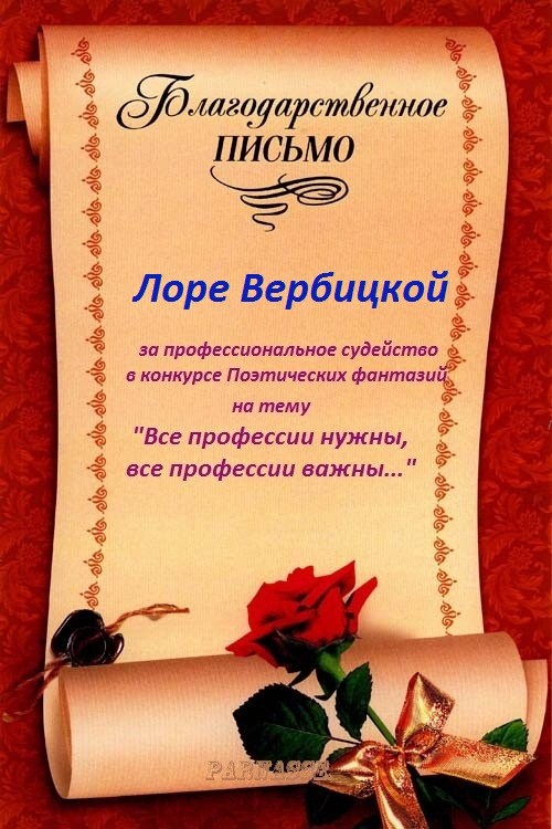 Уважаемая Лора! СПАСИБО БОЛЬШОЕ за оказанную финансовую помощь Парнасу! Добра Вам, благополучия и всего самого наилучшего