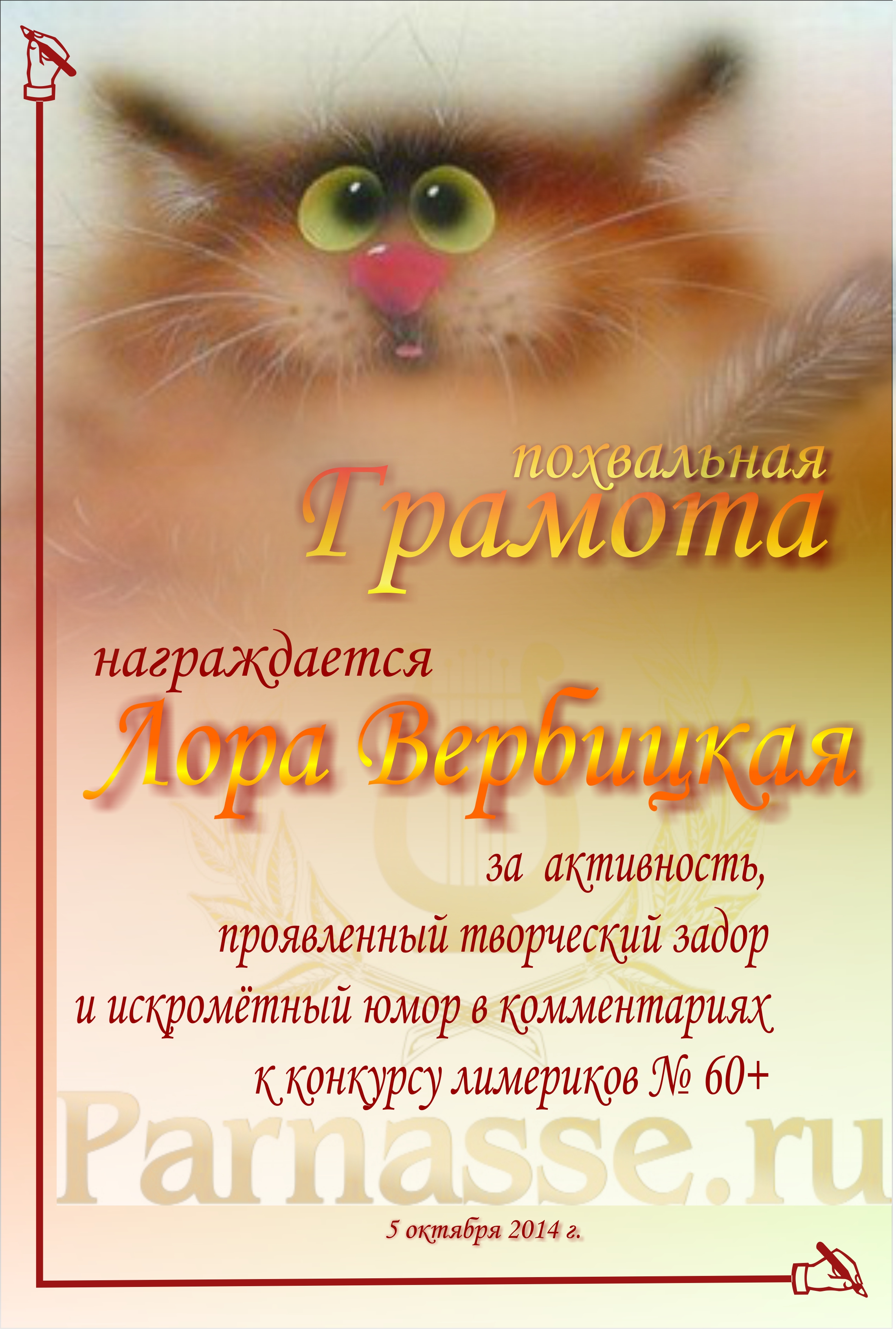Похвальная грамота за активность в комментариях к конкурсу лимериков № 60+ (05.10.2014 г.)
