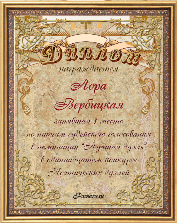 Диплом за 1-е место в номинации "Лучшая дуэль" по итогам судейского голосования в одиннадцатом конкурсе поэтических дуэлей (№ 19.1)