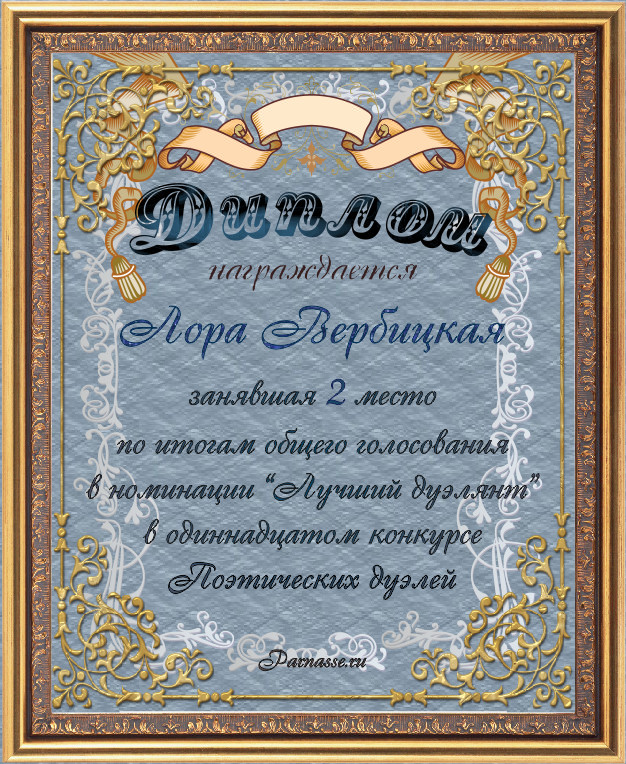 Диплом за 2-е место в номинации "Лучший дуэлянт" по итогам общего голосования в одиннадцатом конкурсе поэтических дуэлей