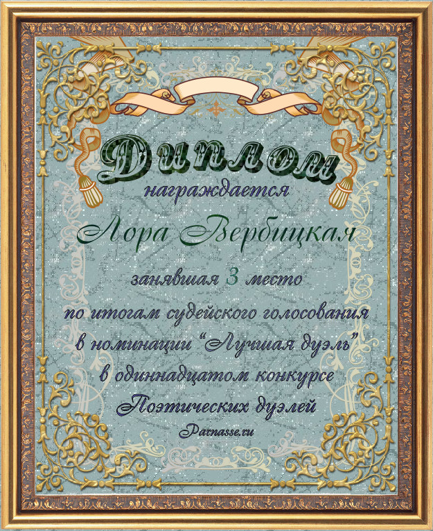 Диплом за 3-е место в номинации "Лучшая дуэль" по итогам общего голосования в одиннадцатом конкурсе поэтических дуэлей (№ 6.2)