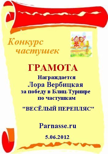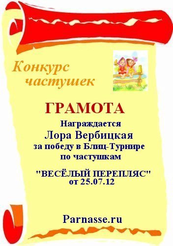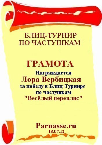 Грамота за победу в Блиц-турнире "Веселый перепляс" от 25.07.12