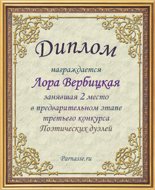 Диплом за второе место в предварительном этапе третьего конкурса Поэтических дуэлей.